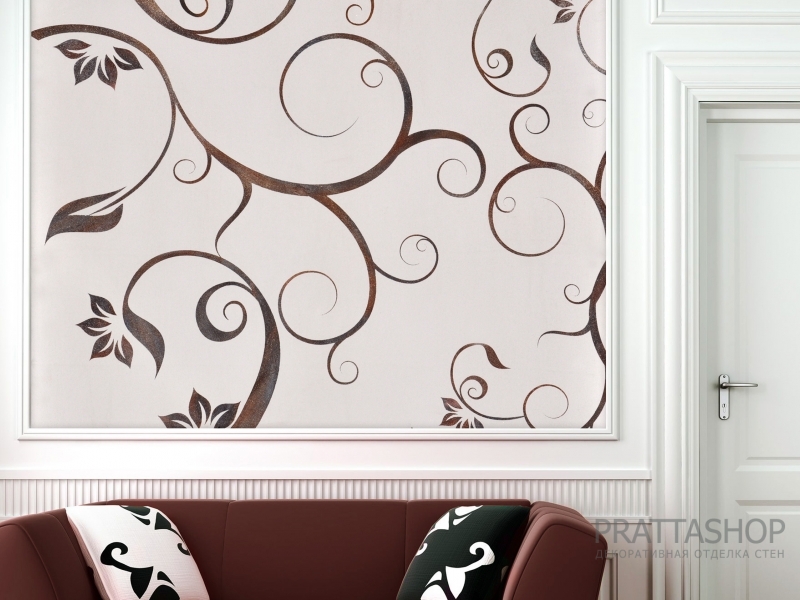 Интерьерное декоративное покрытие с текстурой натурального камня и трафаретным узором в гостевой комнате. Орнамент покрыт специальным финишем METALLINE, который придал ему изящный механизированный эффект. Минеральная штукатурка на акриловой основе для создания различных фактур в трафаретной технике. Пластичные свойства материала и широкая цветовая гамма открывают огромные возможности для вашего творчества. Данное покрытие колеруется в массе, поэтому поверхность способна скрывать легкие повреждения, что актуально для декорирования поверхностей в общественных местах.
