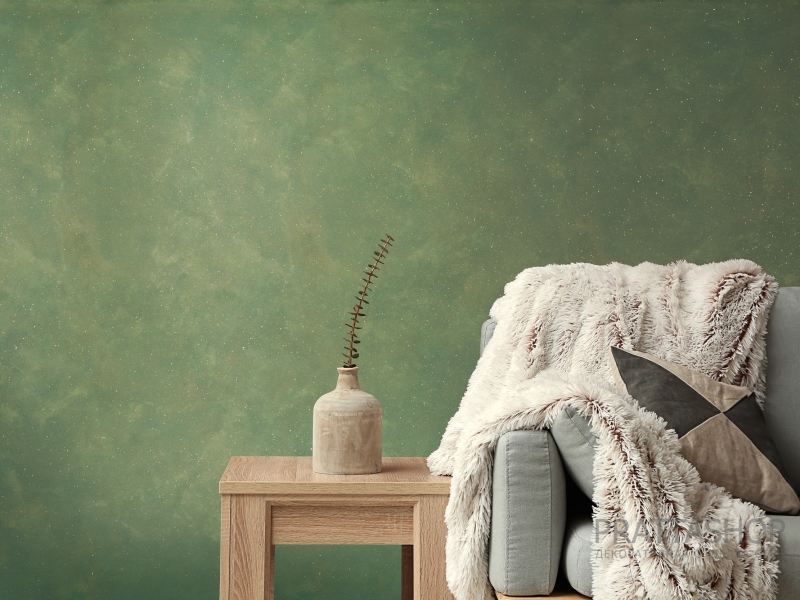 Интерьерное матовое покрытие с эффектом велюровой ткани прошитой редкими золотистыми нитями и с золотисто мерцающими блестками. Данное покрытие, при колеровке в различные цвета, обеспечит теплые оттенки, сопровождающиеся золотистыми вкраплениями микро частиц, которые в совокупности придают декору чарующий эффект благородной ткани. В покрытие можно добавлять, по своему усмотрению, специальные золотистые блестки, которые проявляются только в момент изменения угла обзора или освещения, что придаст поверхности дополнительный акцент с ненавязчивой привлекательностью. Покрытие является влагостойким и моющимся, поэтому не требует дополнительной защиты от влаги.