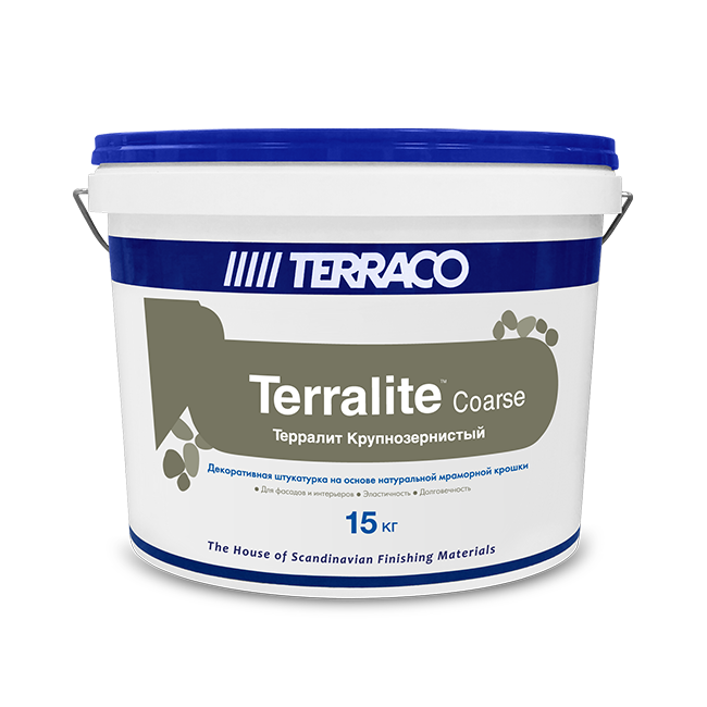Терралит Крупнозернистый -это готовое к применению цветное финишное штукатурное акриловое покрытие наполненное натуральной мраморной крошкой природных оттенков. Терралит Крупнозернистый обеспечивает качественную архитектурную отделку поверхности, придает ей высокую механическую прочность, долговечность и привлекательный вид натурального мраморного камня.