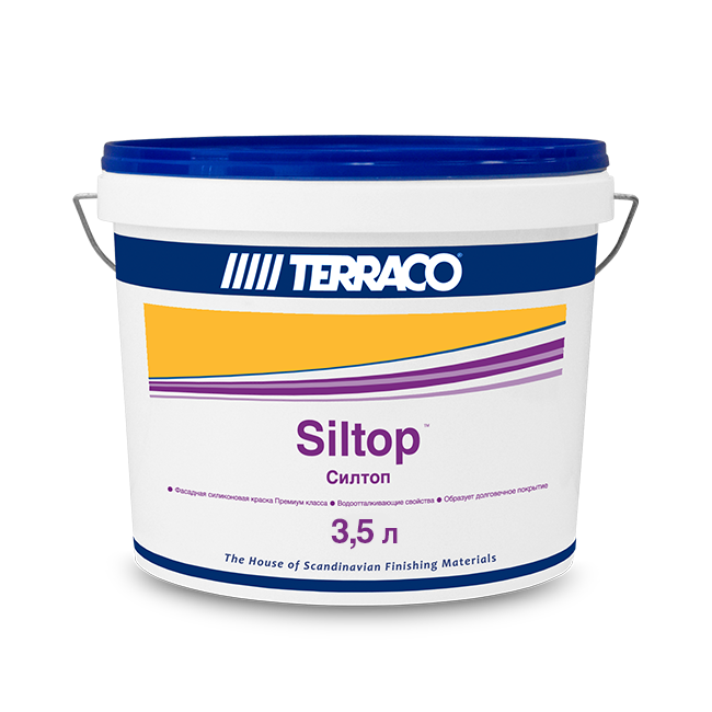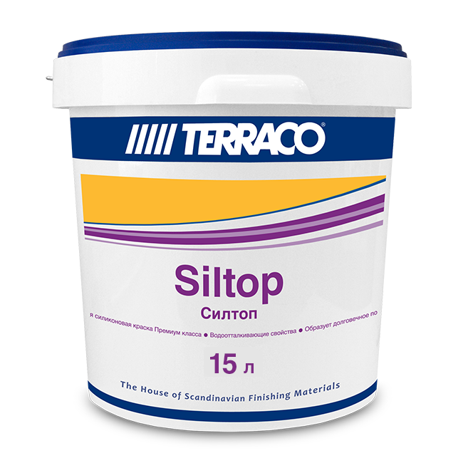 Силтоп – фасадная краска с высоким содержанием силиконового полимера (эмульсии) предназначенная для высококачественных отделочных работ на минеральных поверхностях любого типа. Силттоп образует равномерное матовое окрасочное покрытие, позволяя максимально проявляться всем преимуществам и техническим характеристикам силиконовых материалов, что позволяет обеспечивать более продолжительную защиту и эксплуатацию окрашенным Силтопом конструкциям.