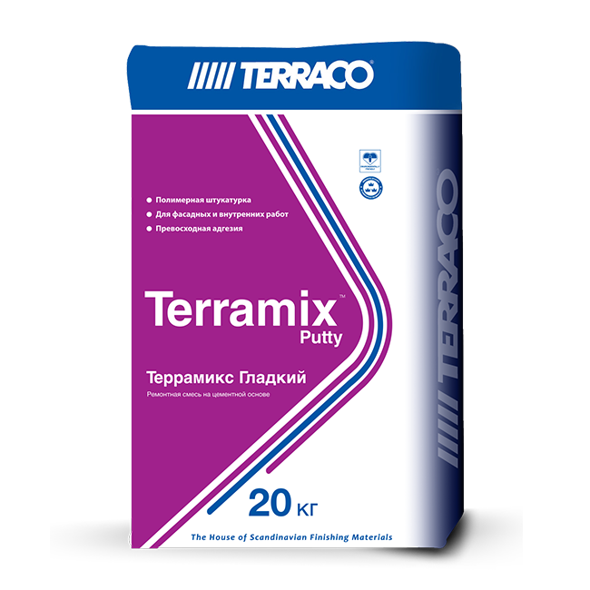 Террамикс Гладкий– тонкослойная шпатлевочная смесь на основе цемента и очень мелких фракций наполнителя, может применяться на внешних и внутренних поверхностях для мелкого ремонта основания и получения прочной и идеально гладкой подготовленной поверхности под отделку, обладающей водоотталкивающими свойствами и пригодной для нанесения краски, декоративных покрытий и оклеивания обоями.