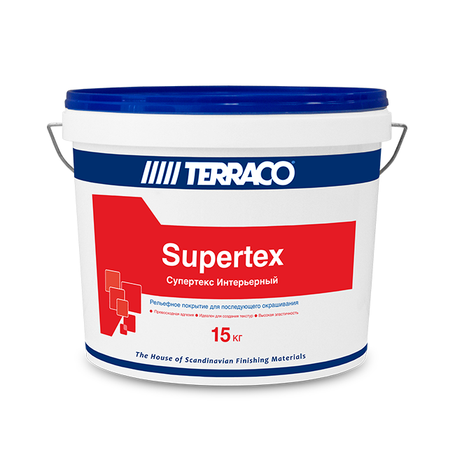 Последующие работы по декорированию и окраске нанесенного Супертекс Интерьерный допускается выполнять не ранее чем через 24 часа. Для окраски могут использоваться стандартные фасадные и интерьерные краски Террако, а также один из вариантов специальных декоративных красок, эффект образующих покрытий Террако - Хэндистайл, Фреско, Хэнди Плюс или другие.