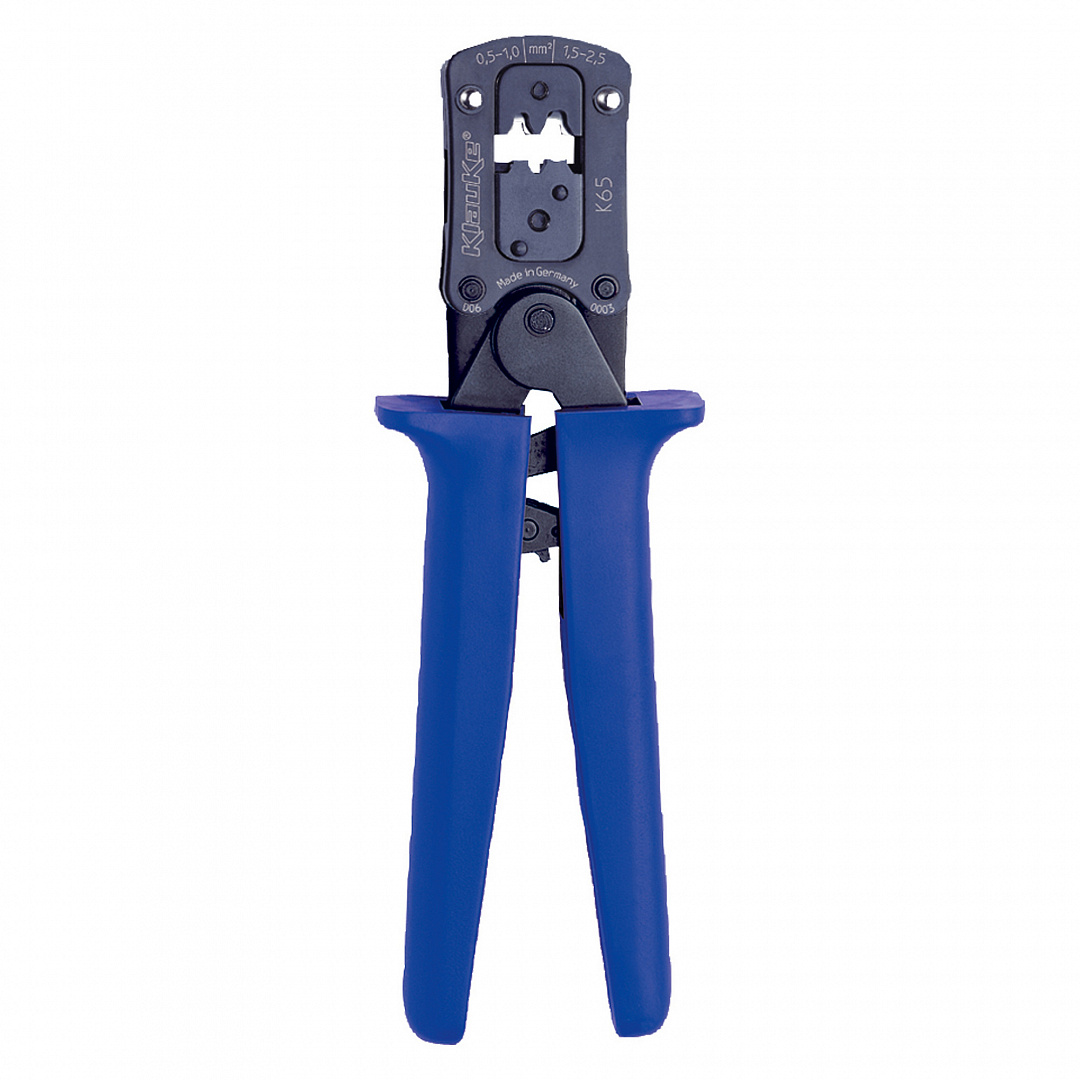 Механический инструмент Klauke K65 для опрессовки неизолированных плоских разъемов (вилки и розетки) с шириной контактной площадки 4,8 мм, сечение 0,5-2,5 мм2.