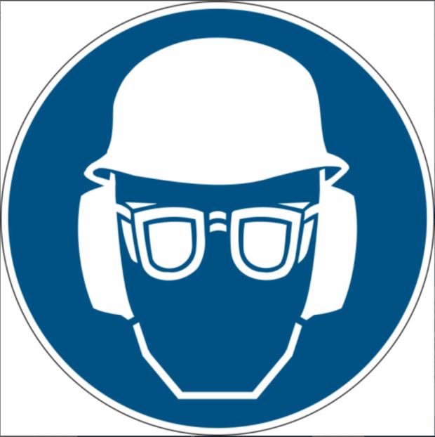 —Предписывающий знак безопасности "Работать в защитных очках, наушниках и каске"
