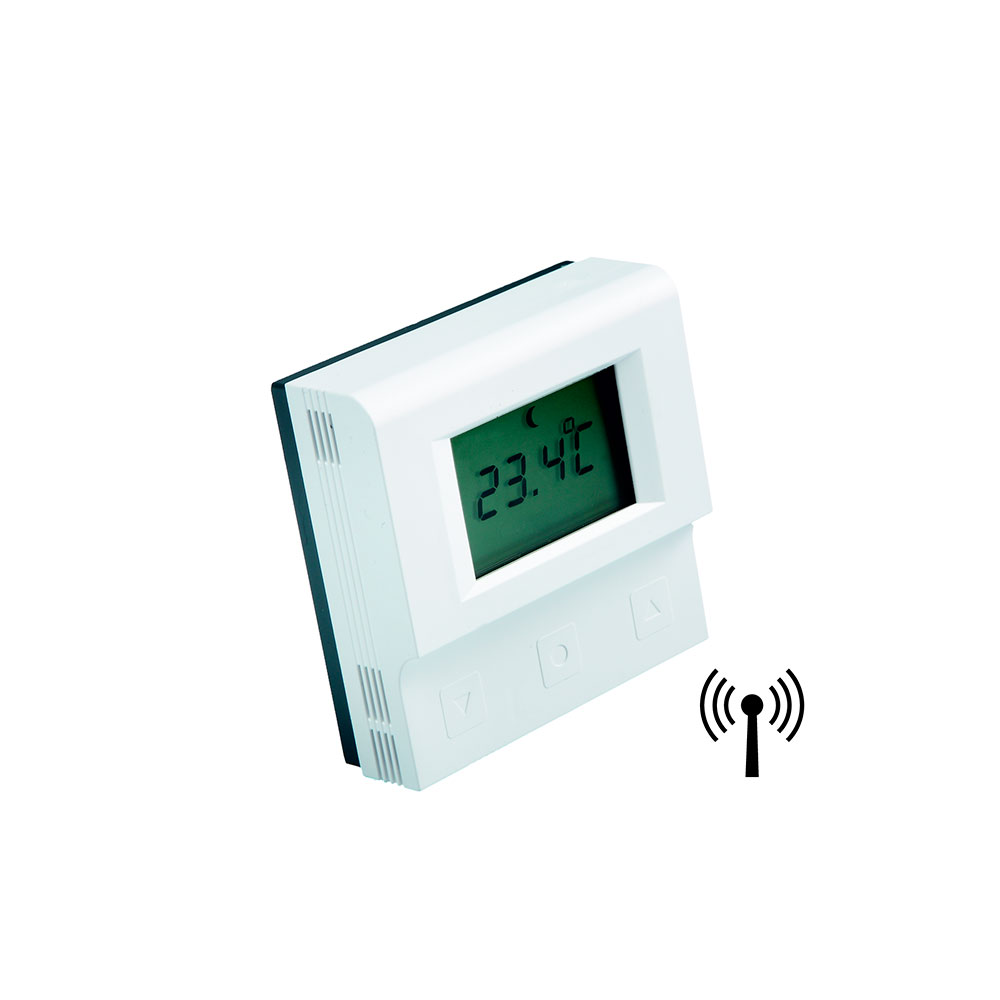 Для управления термостатом необходима беспроводная коммутационная коробка арт. 7744001х. Функции работы на обогрев или охлаждение обеспечиваются коммутационной коробкой. Радиус действия термостата – примерно до 25 метров от коммутационной коробки в зависимости от материала стен.