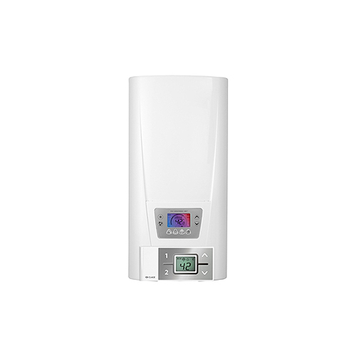 - Полностью электронная система управления позволяет точно установить температуру в диапазоне между 20 и 60 °C с точностью 0,5 °C и поддерживать ее вне зависимости от расхода и температуры воды на входе в прибор благодаря использованию технологий контроля температуры TWIN TEMPERATURE Control TTC® и динамического управления потоком SERVOTRONIC® с помощью встроенного вентиля со смесителем.