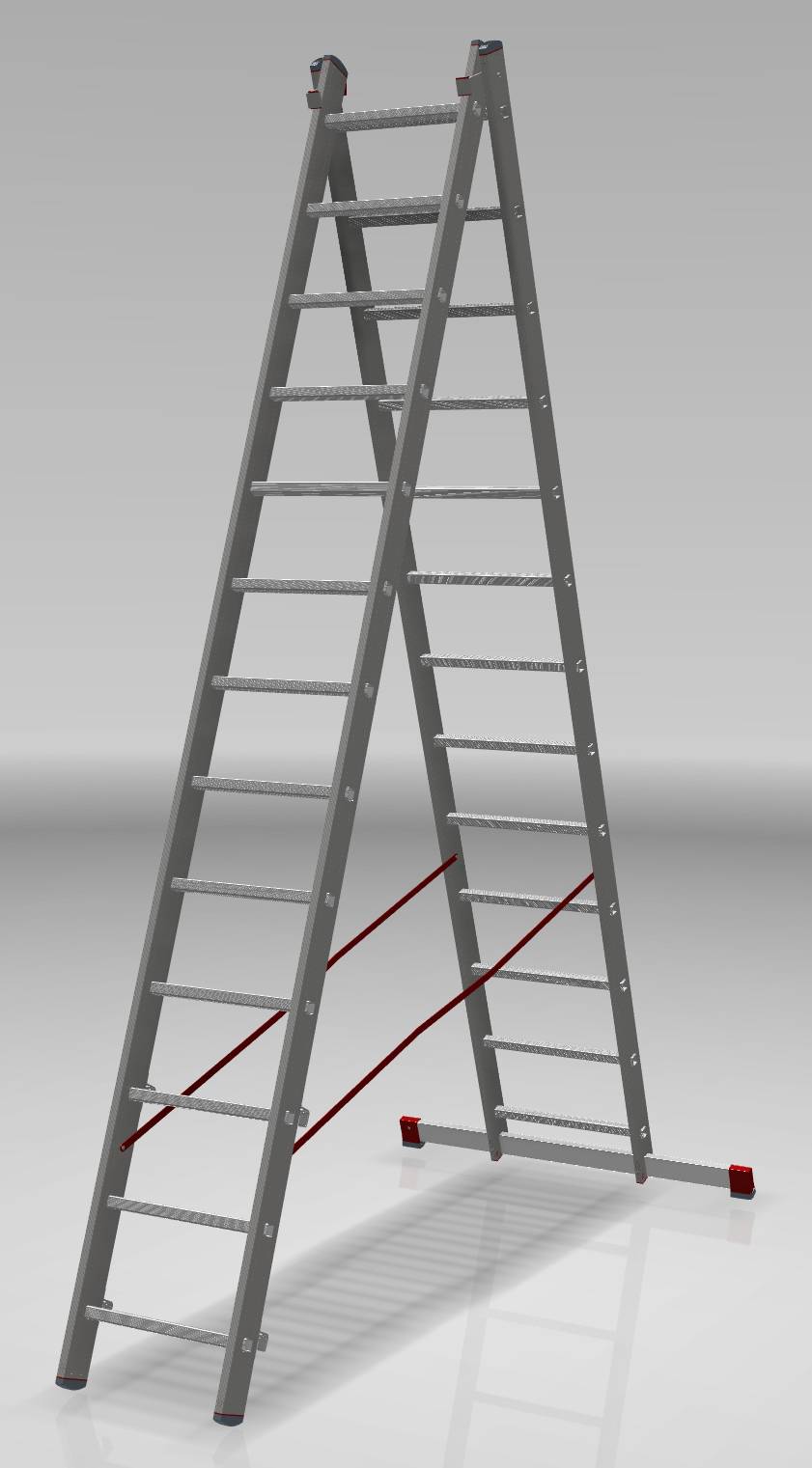 - Опорные наконечники стоек и траверсы из прочного двухкомпонентного пластика на заклёпках (жёсткий компонент отвечает за надёжность крепления, мягкий препятствует скольжению лестницы)