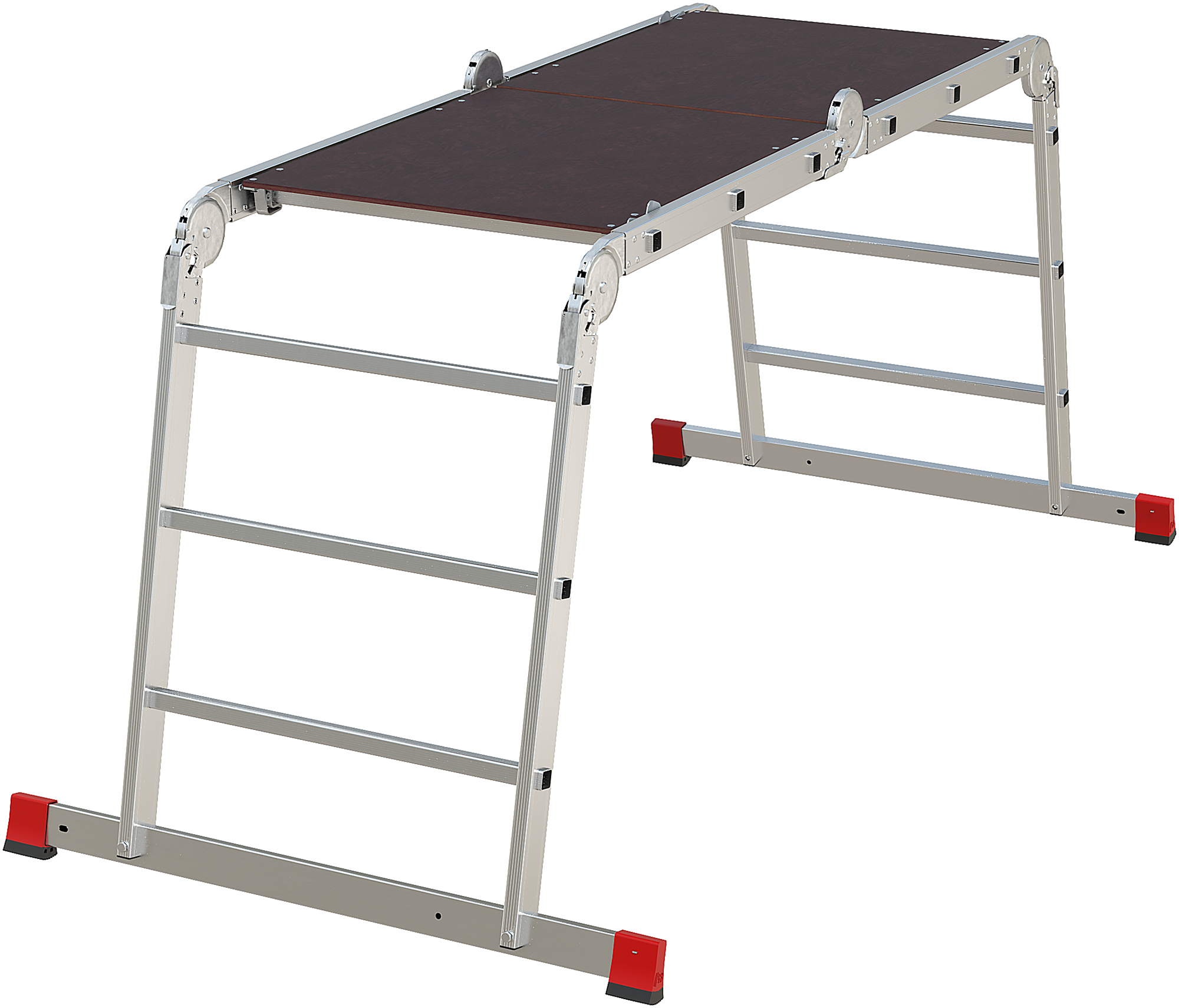 Высокопрочная лестница «4 в 1»: приставная, Г-образная с опорой на стену, двухсторонняя стремянка, подмости, помост со съёмным настилом в комплекте. Больше пространства для свободы перемещений.