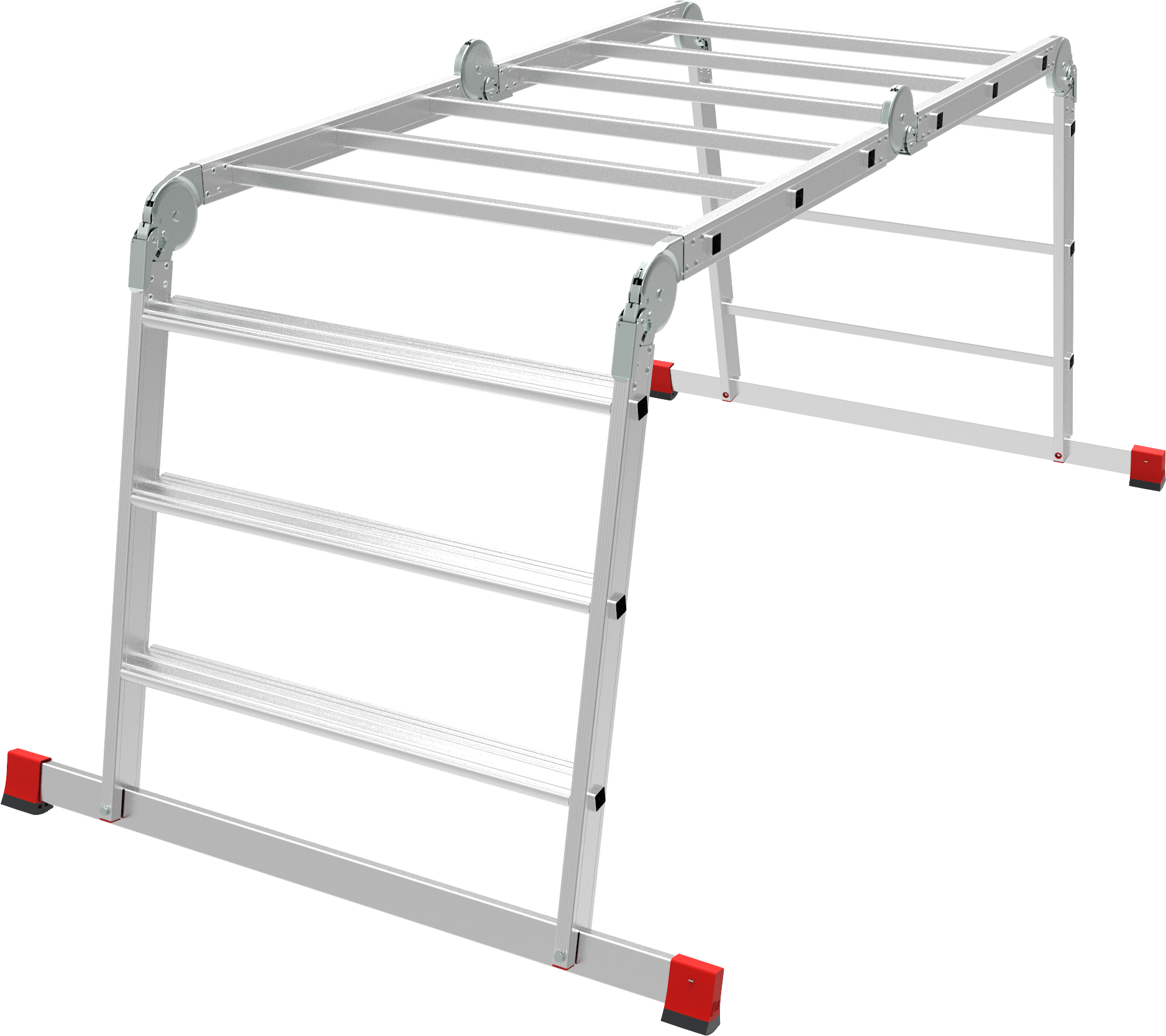 Высокопрочная лестница «4 в 1»: приставная, Г-образная с опорой на стену, двухсторонняя стремянка, помост с широкими ступенями на подъёмной секции. Больше пространства для свободы перемещений. Используется как рабочий стол.