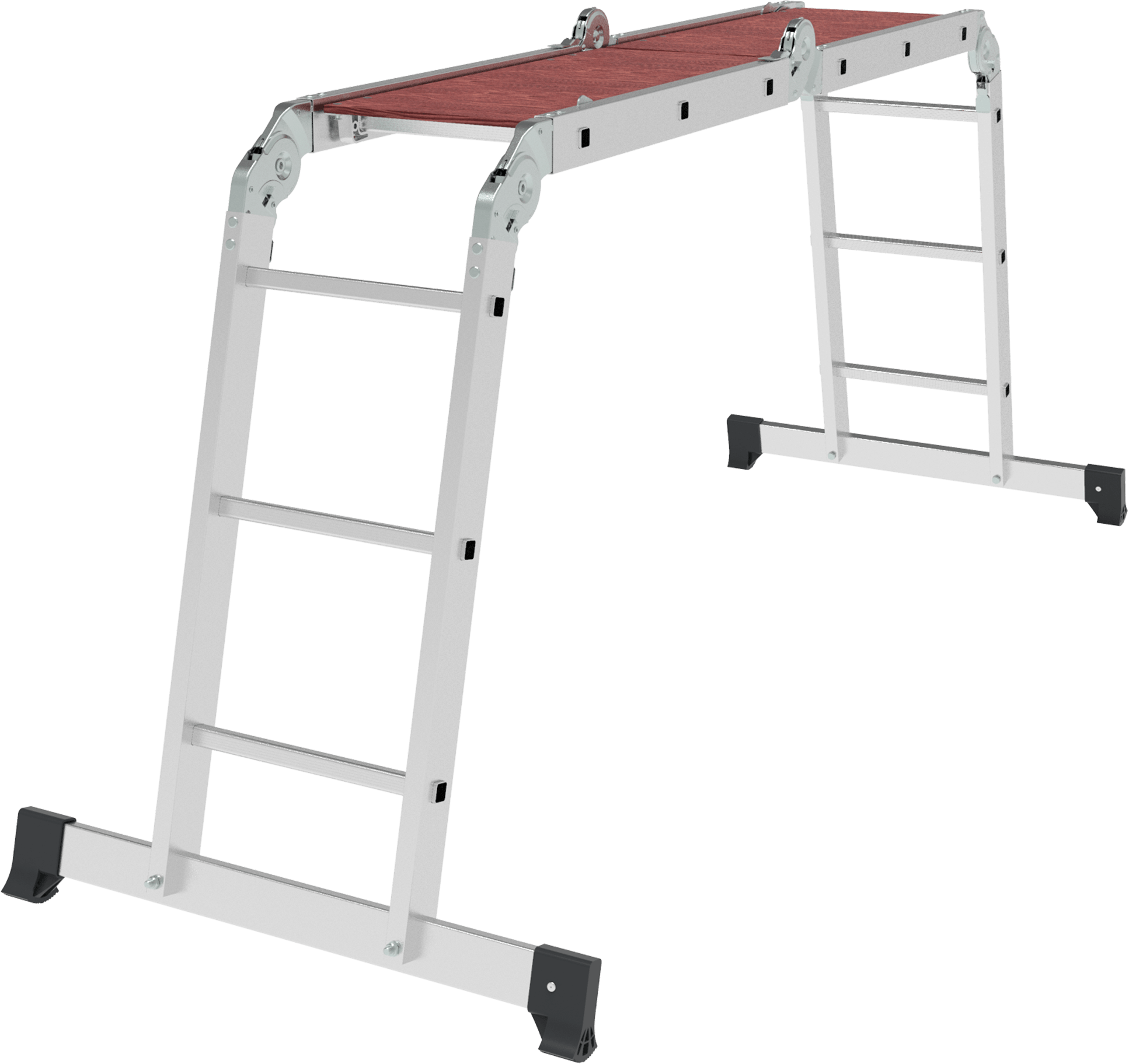 Многофункциональная шарнирная лестница «4 в 1» для бытового использования: приставная, Г-образная с опорой на стену, двухсторонняя стремянка, помост со съёмным настилом.