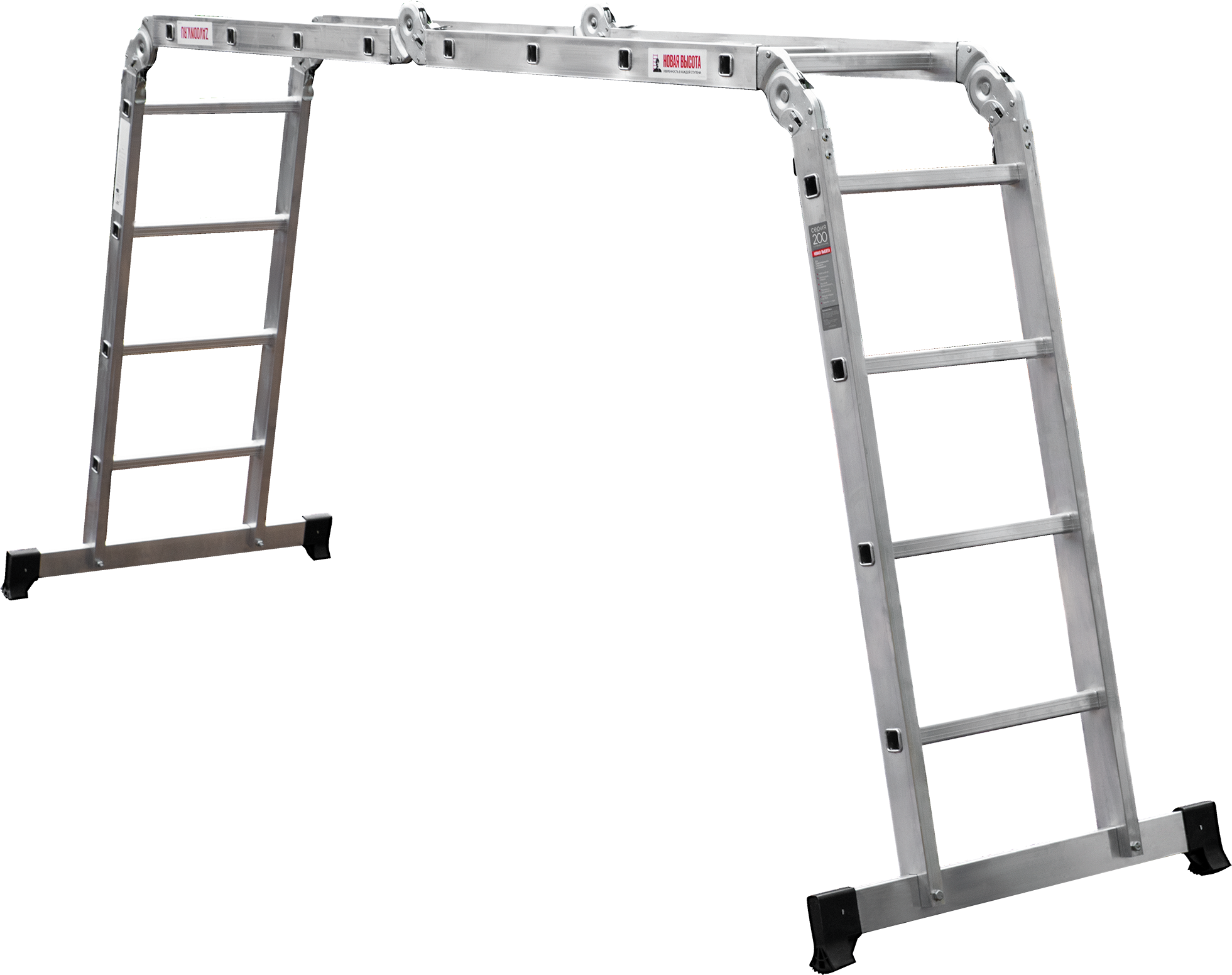 Многофункциональная улучшенная шарнирная лестница «4 в 1» увеличенной шириной для бытового использования с повышенными нагрузками: приставная, Г-образная с опорой на стену, двухсторонняя стремянка, помост.