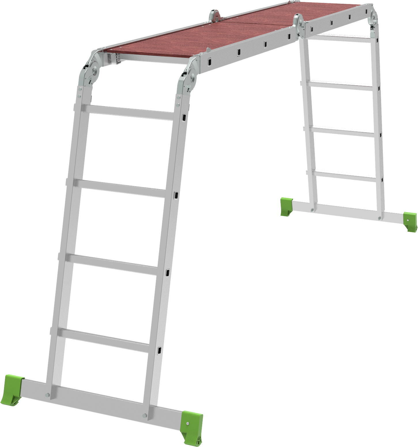 Многофункциональная улучшенная шарнирная лестница «4 в 1» увеличенной шириной для бытового использования с повышенными нагрузками: приставная, Г-образная с опорой на стену, двухсторонняя стремянка, помост со съёмным настилом.