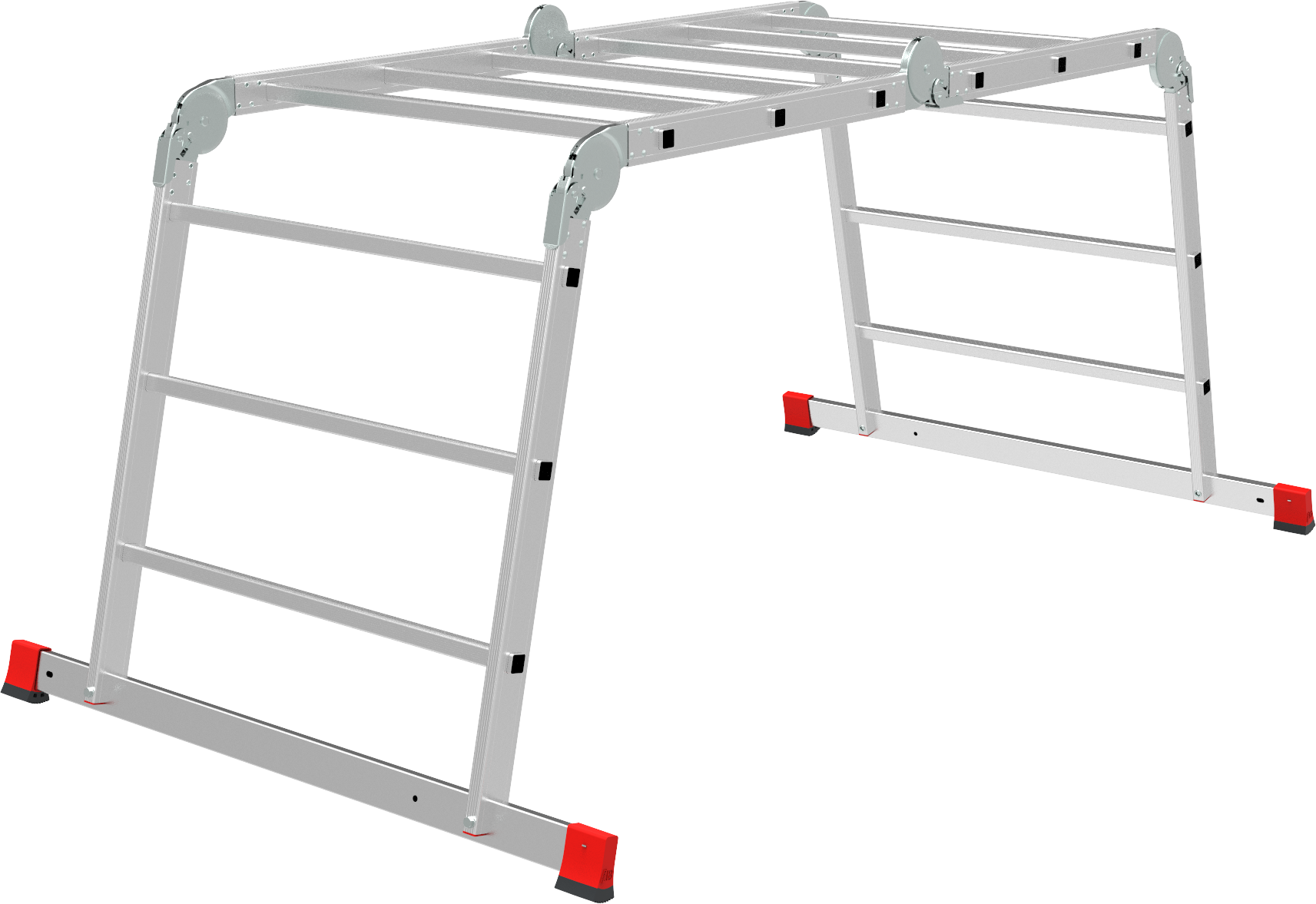 Высокопрочная лестница «4 в 1»: приставная, Г-образная с опорой на стену, двухсторонняя стремянка, помост. Больше пространства для свободы перемещений. Используется как рабочий стол.