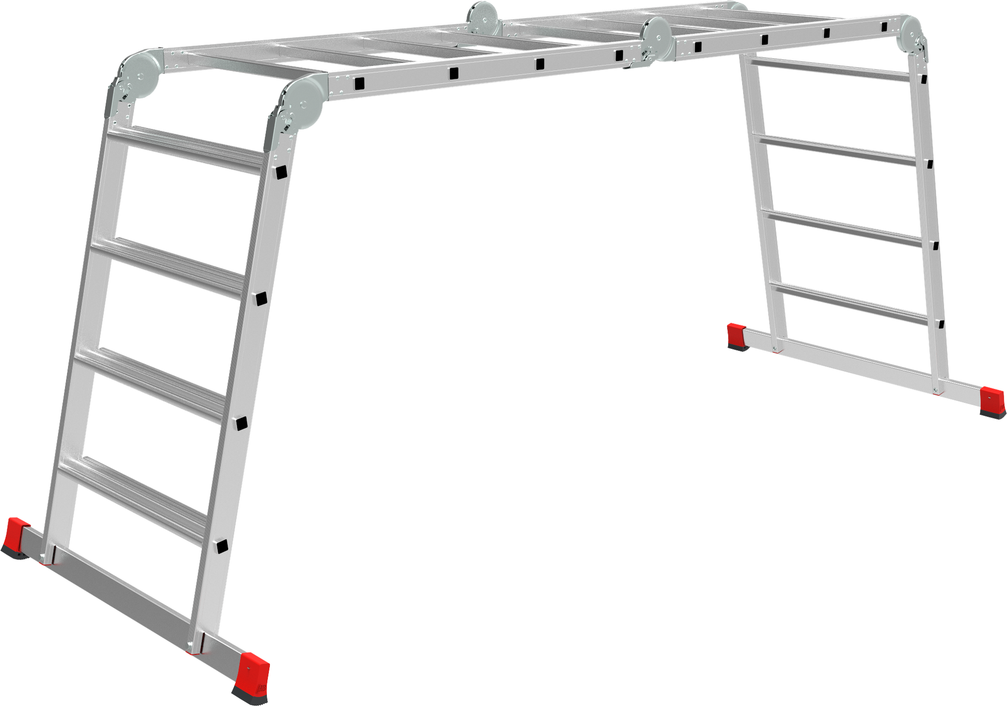 Высокопрочная лестница «4 в 1»: приставная, Г-образная с опорой на стену, двухсторонняя стремянка, помост с широкими ступенями на подъёмной секции. Больше пространства для свободы перемещений.