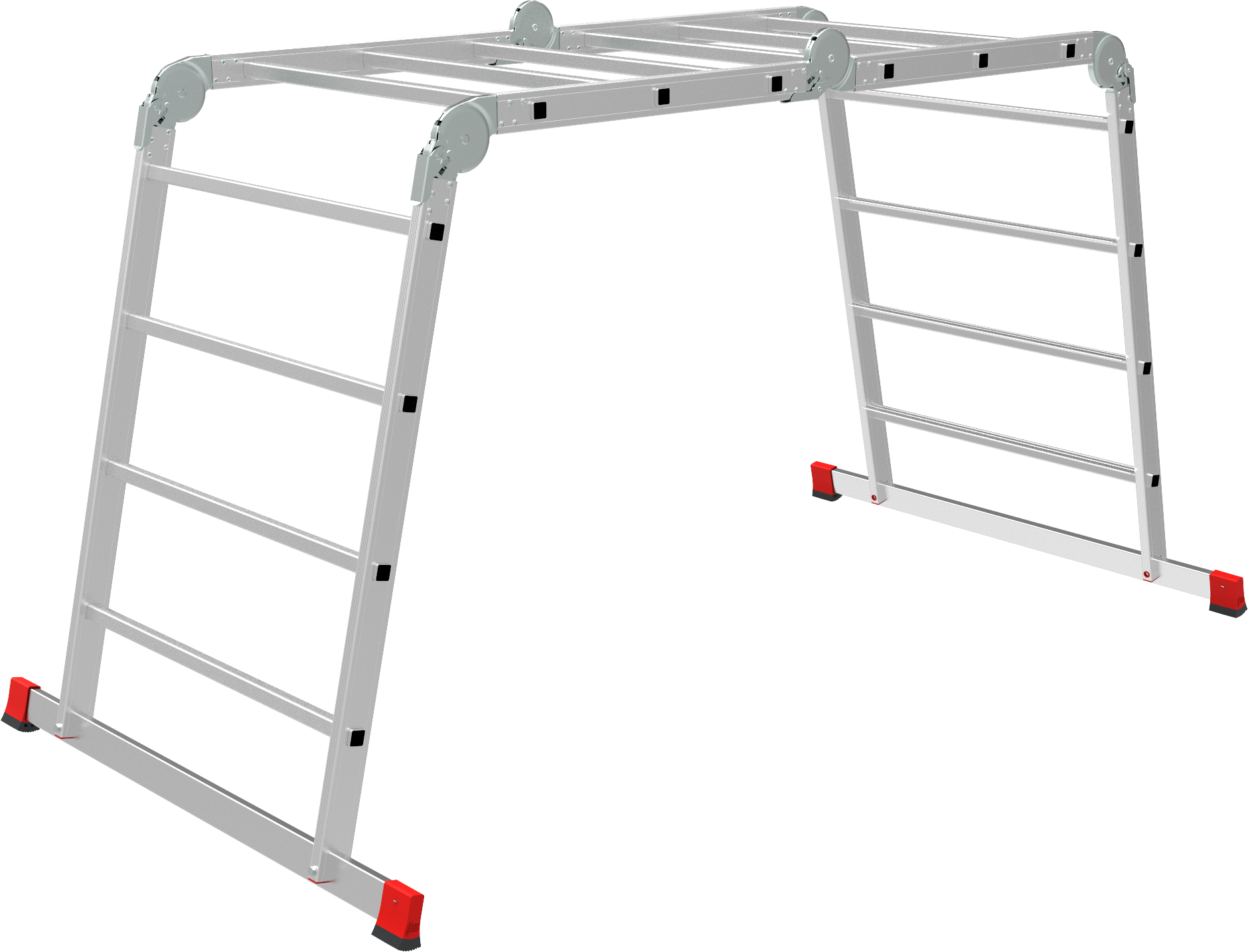 Высокопрочная лестница «4 в 1»: приставная, Г-образная с опорой на стену, двухсторонняя стремянка, помост с широкими ступенями на подъёмной секции. Больше пространства для свободы перемещений. Используется как рабочий стол.