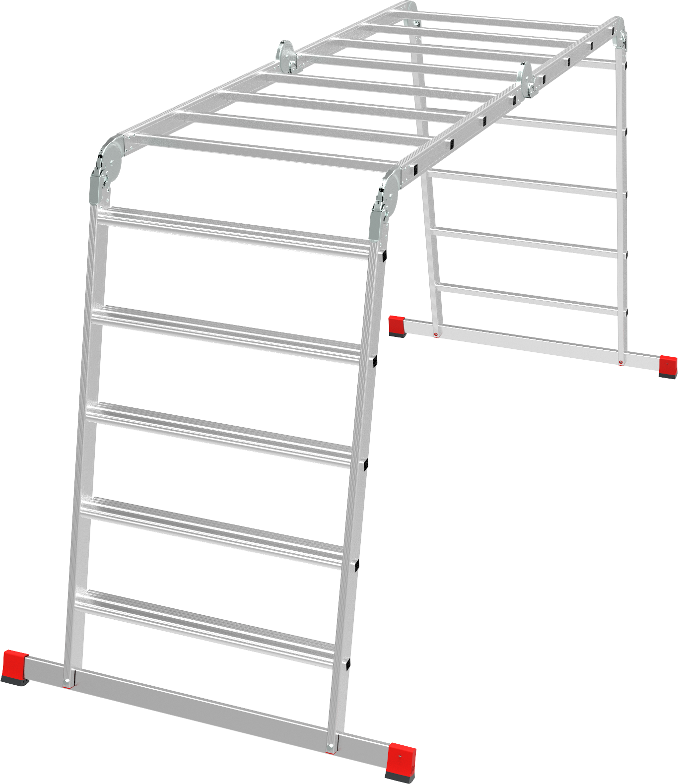 Высокопрочная лестница «4 в 1»: приставная, Г-образная с опорой на стену, двухсторонняя стремянка, помост с широкими ступенями на подъёмной секции. Больше пространства для свободы перемещений. Используется как рабочий стол.