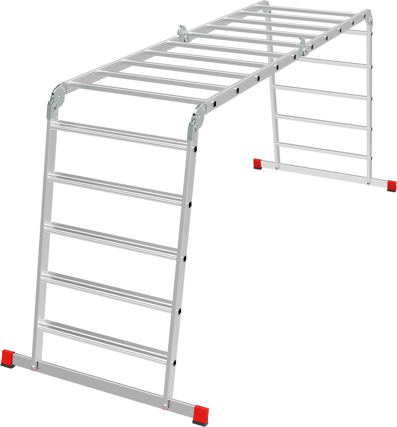 Высокопрочная лестница «4 в 1»: приставная, Г-образная с опорой на стену, двухсторонняя стремянка, помост с широкими ступенями на подъёмной секции. Больше пространства для свободы перемещений. Используется как рабочий стол.