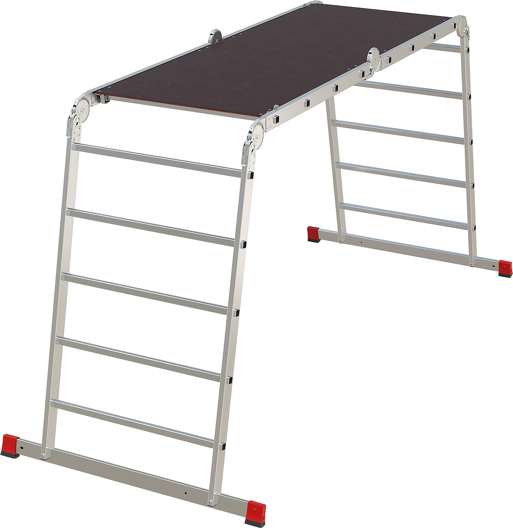 Высокопрочная лестница «4 в 1»: приставная, Г-образная с опорой на стену, двухсторонняя стремянка, помост со съёмным настилом в комплекте. Больше пространства для свободы перемещений. Используется как рабочий стол.