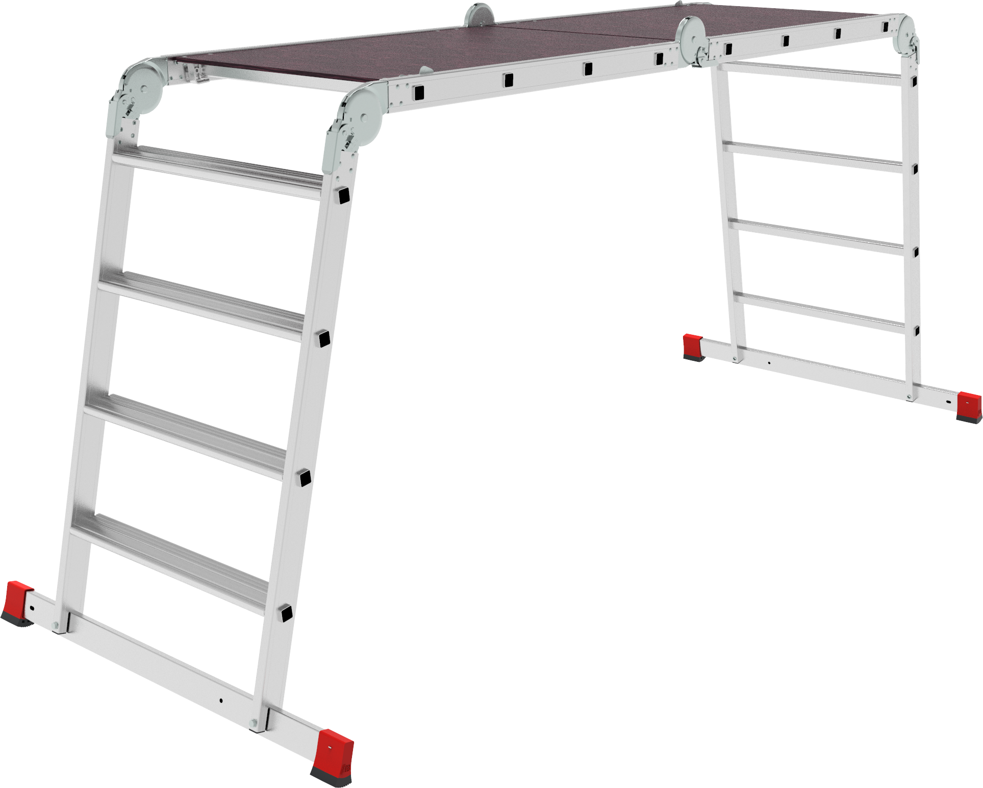 Высокопрочная лестница «4 в 1»: приставная, Г-образная с опорой на стену, двухсторонняя стремянка, помост с широкими ступенями на подъёмной секции и со съёмным настилом в комплекте. Увеличенная ширина для свободы перемещений.