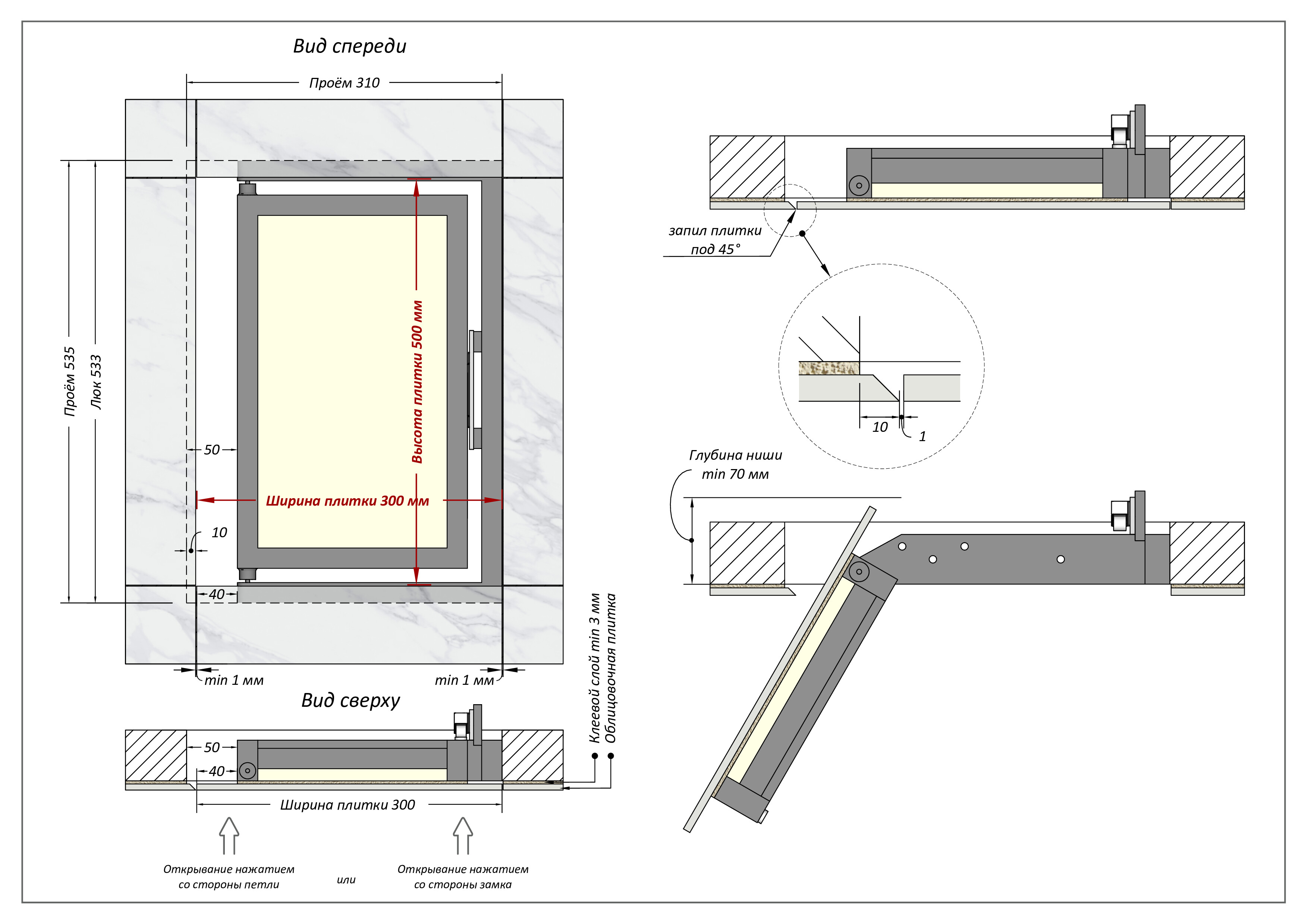 - люк под плитку 30х50 открывается легким нажатием со стороны замка, либо со стороны петель;