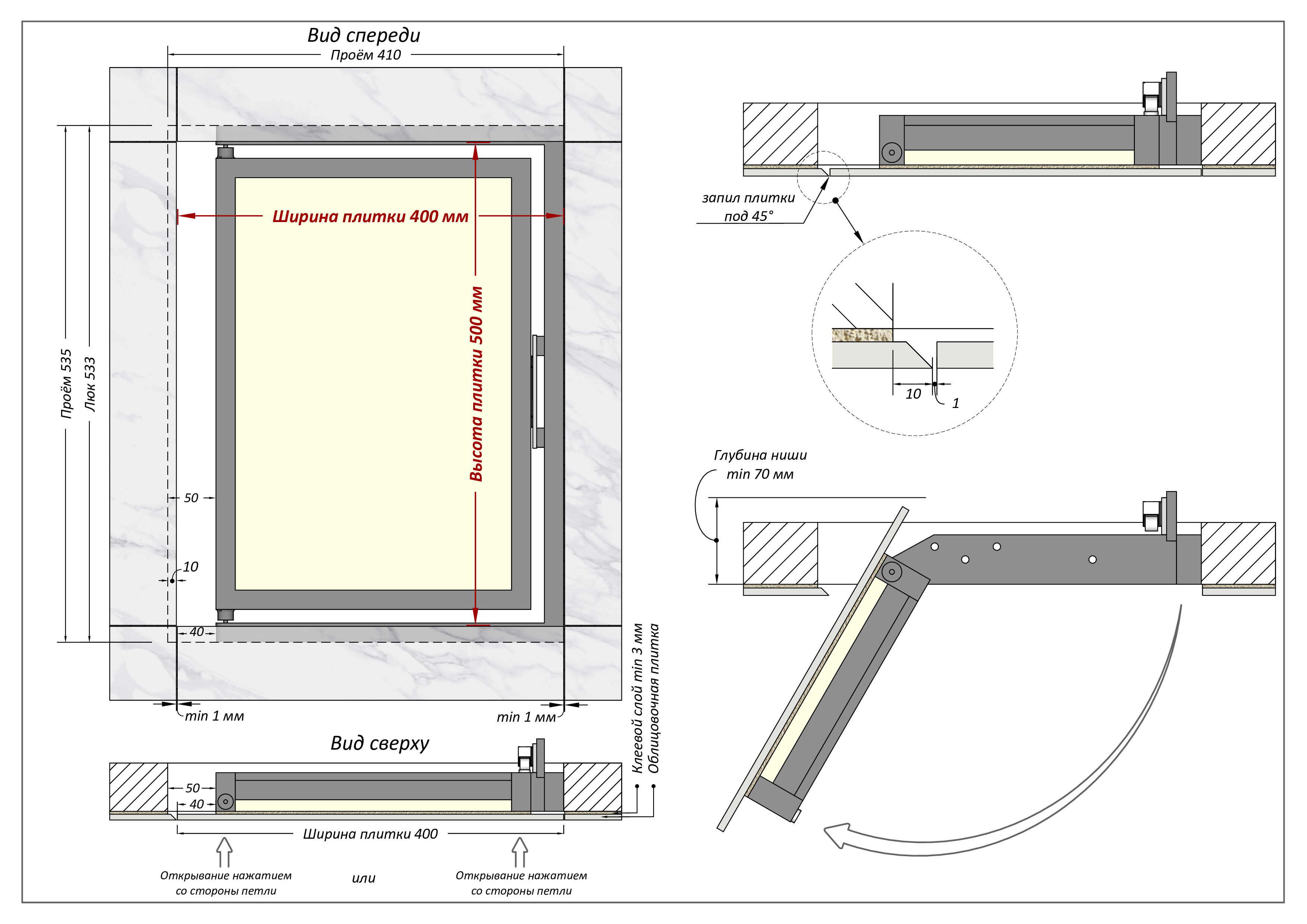 - ревизионный люк под плитку 40 на 50 см открывается легким нажатием со стороны замка, либо со стороны петель;