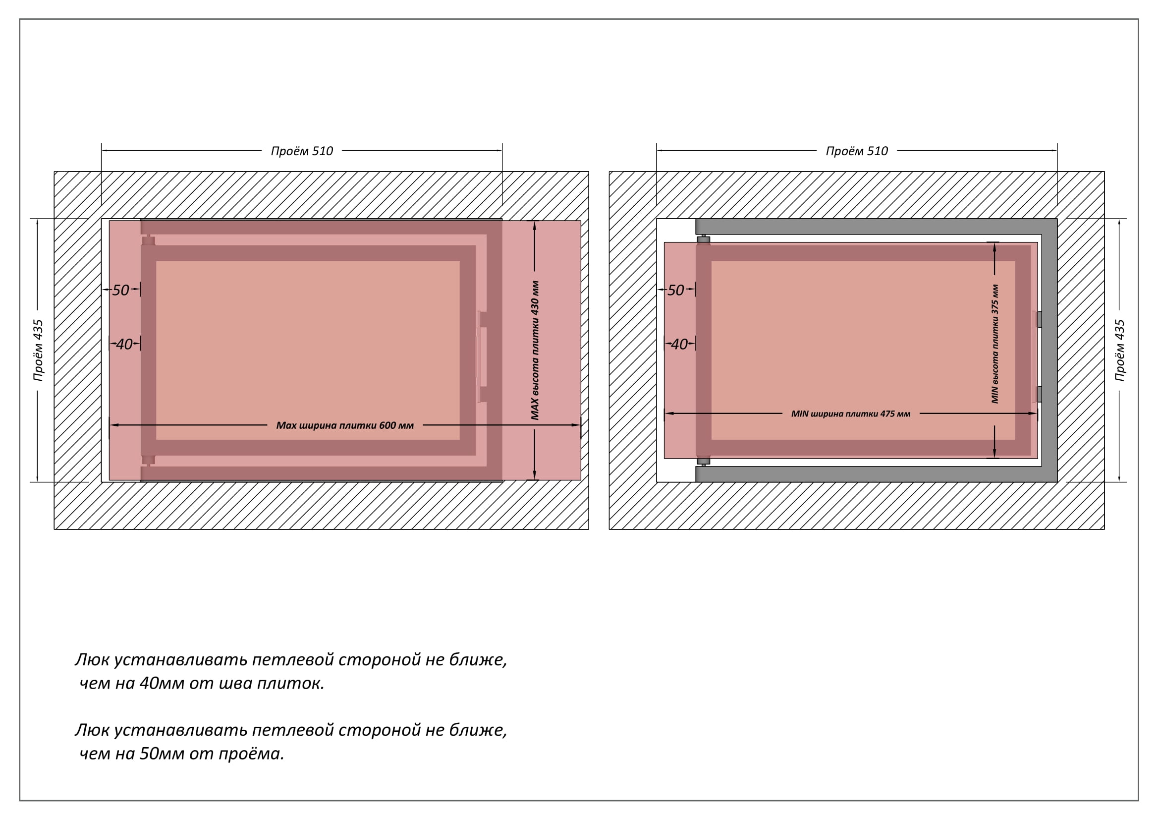 - ревизионный люк под плитку 50 на 40 см открывается легким нажатием со стороны замка, либо со стороны петель;