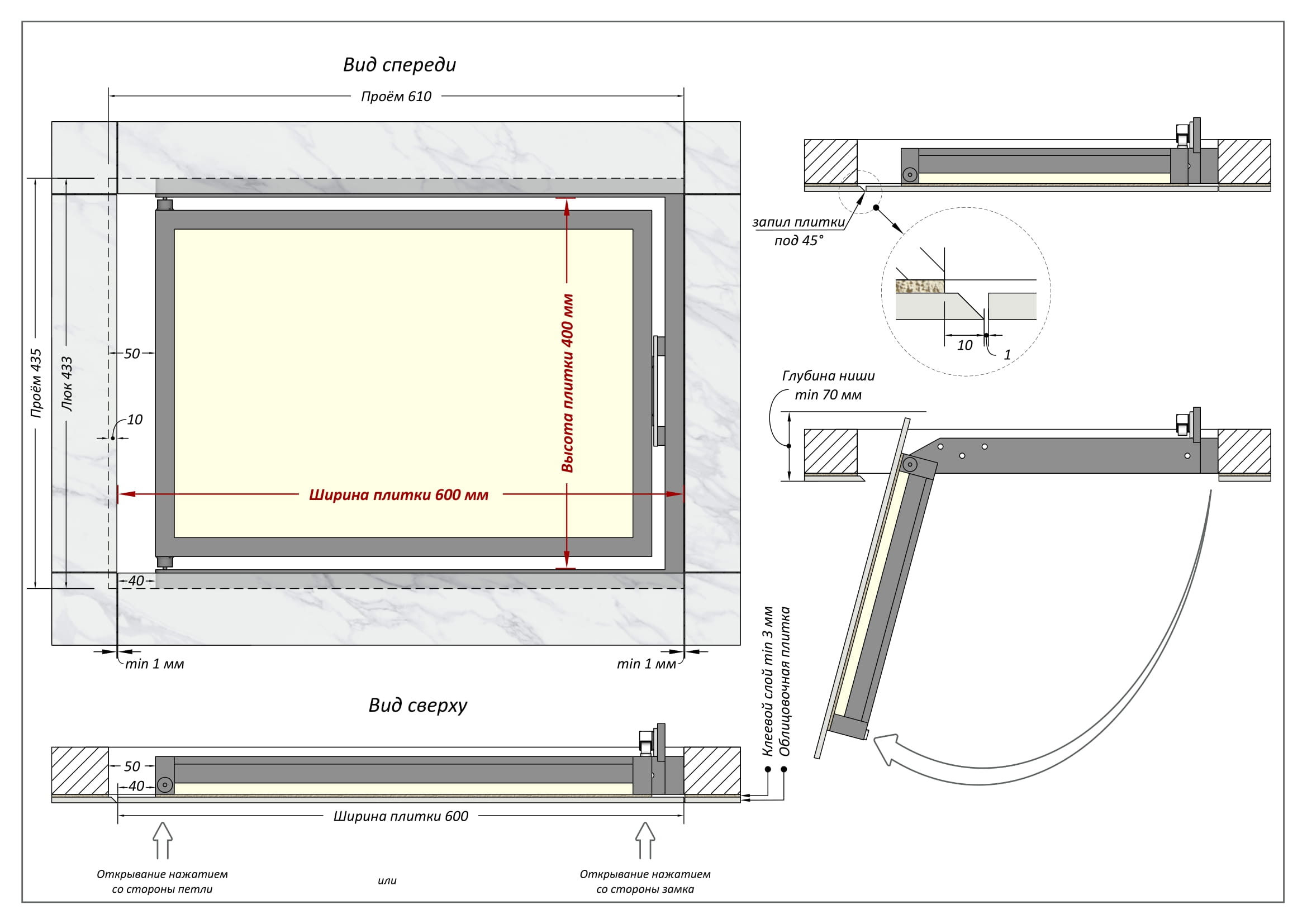- люк сантехнический 600х400 открывается легким нажатием со стороны замка, либо со стороны петель;