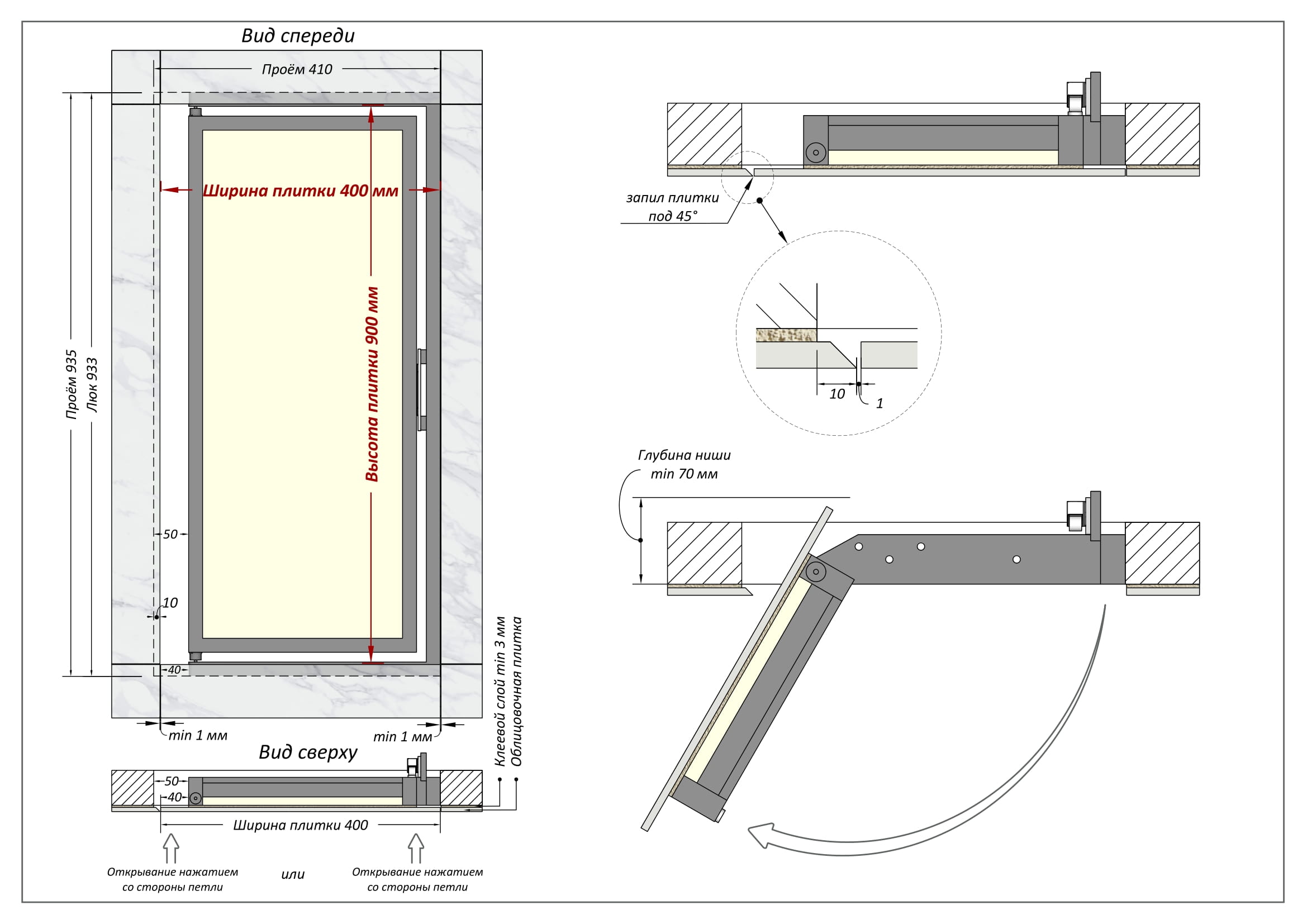 - ревизионный люк под плитку 40 на 90 см открывается легким нажатием со стороны замка, либо со стороны петель;