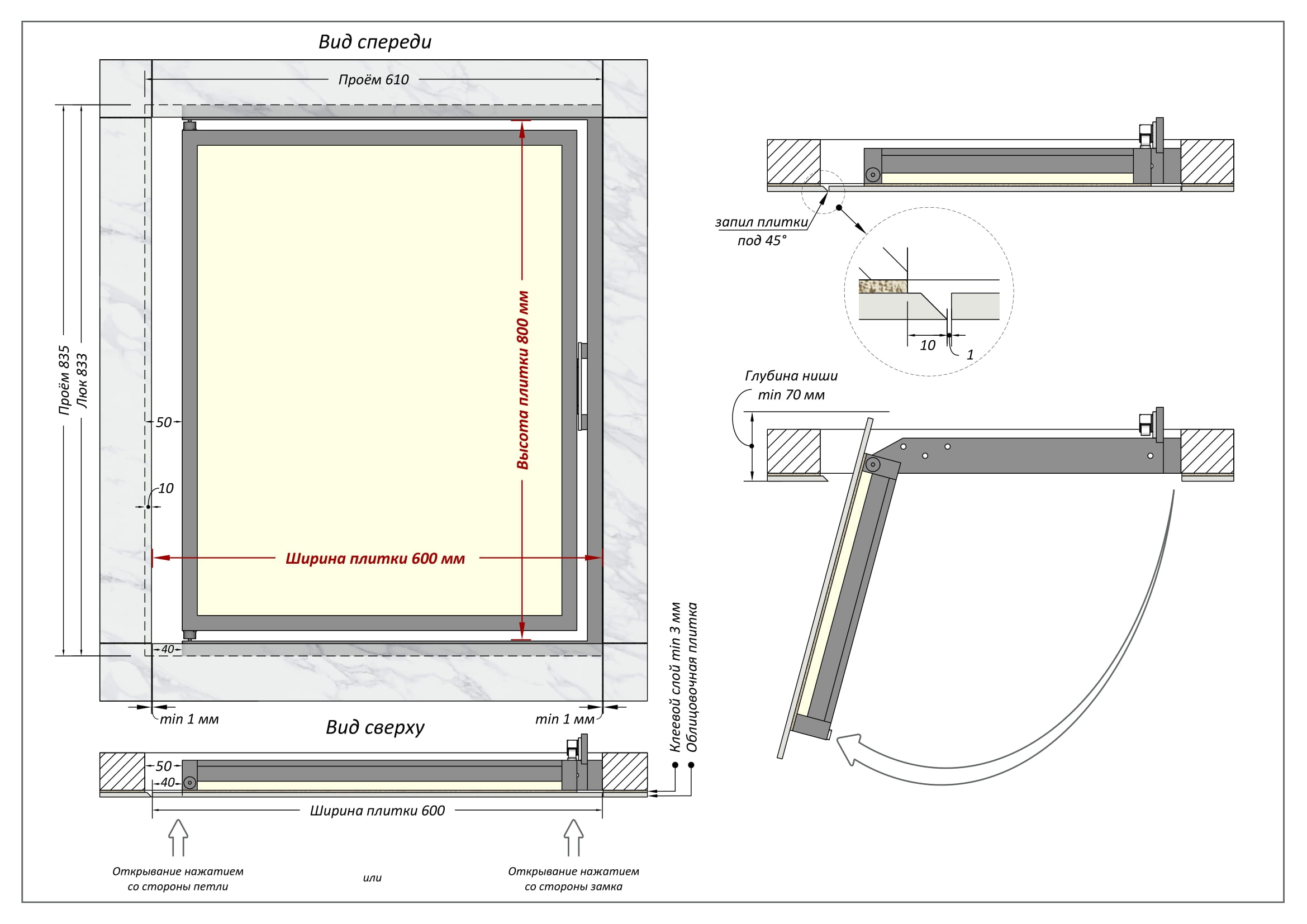 - люк под плитку 60х80 открывается легким нажатием со стороны замка, либо со стороны петель;