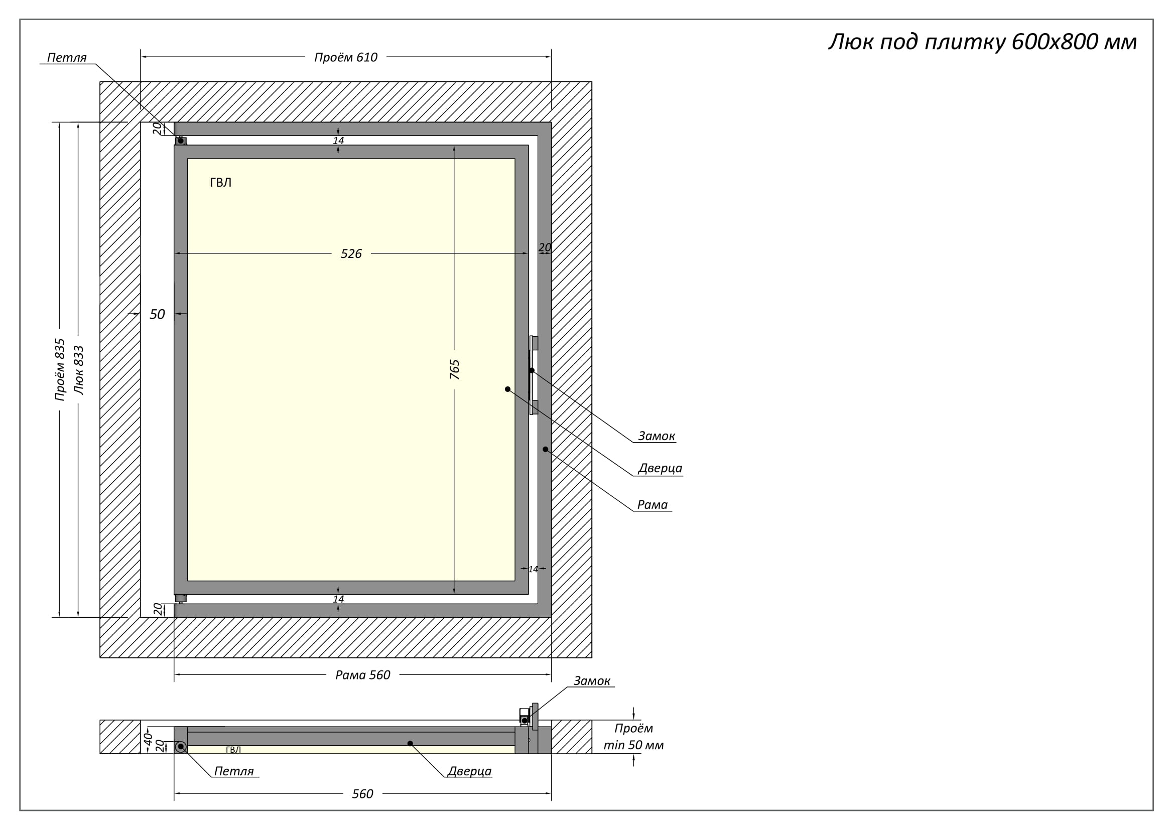 - люк сантехнический 600х800 не имеет провисания под тяжестью облицованного материала;