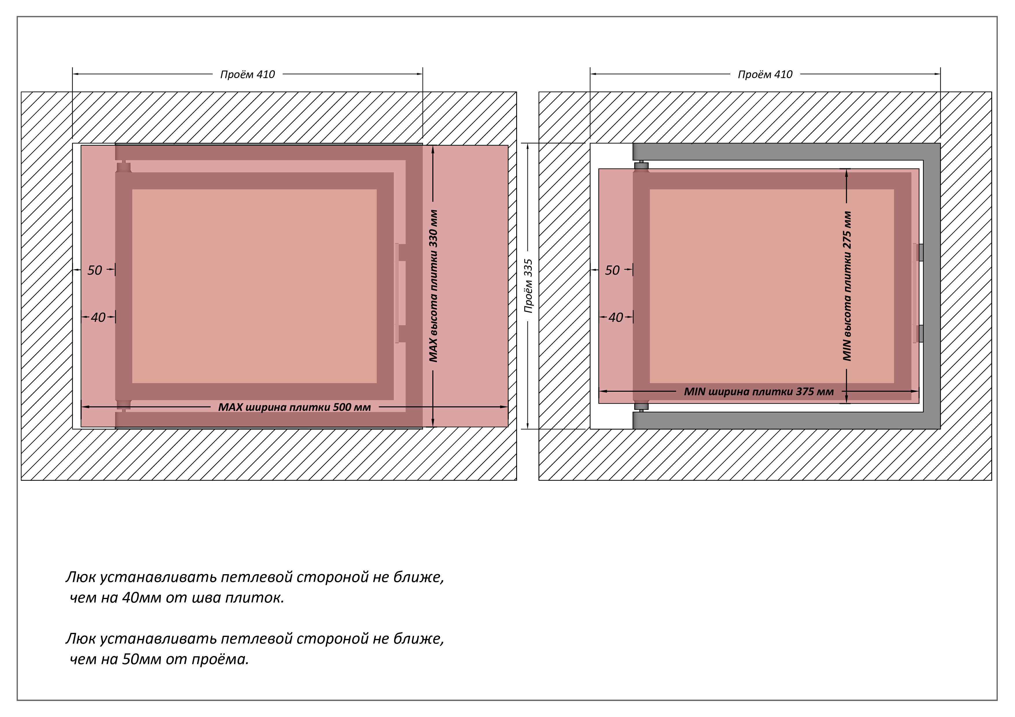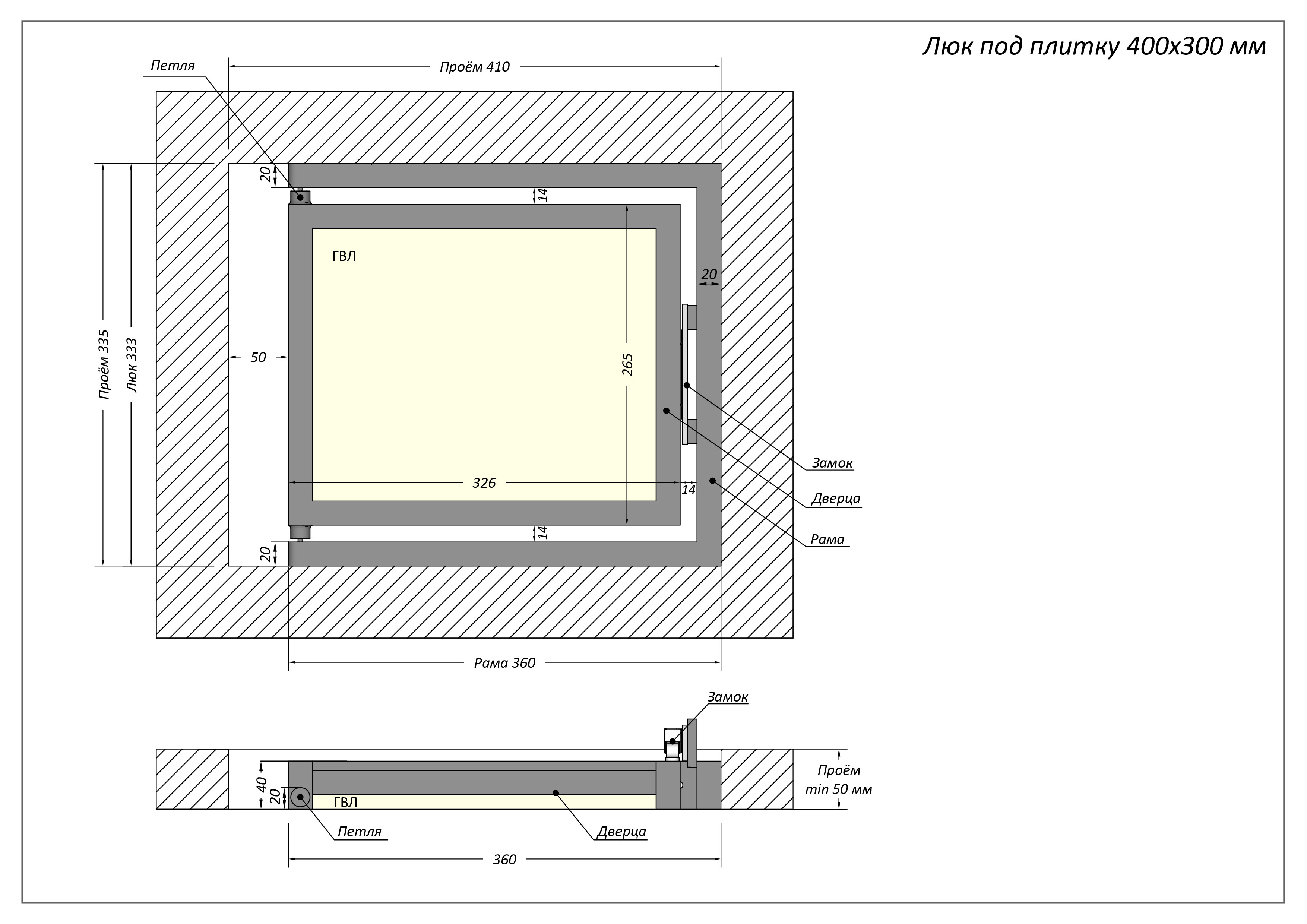 - люк сантехнический 400х300 не имеет провисания под тяжестью облицованного материала;