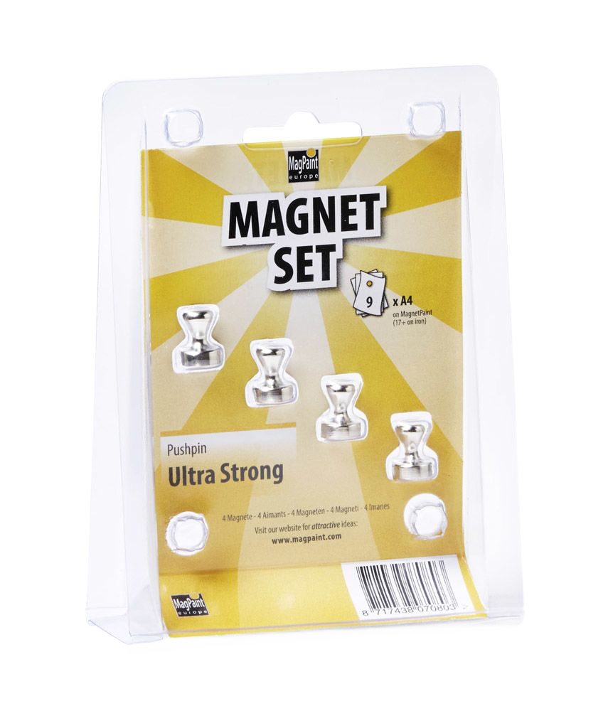 В набор входит 4 неодимовых магнита, которые обладают усиленными магнитными свойствами. Один магнит способен удержать до 9 листов формата А4 на поверхности, окрашенной магнитной краской MagnetPaint (при нанесении в 3 слоя), а на металлической поверхности до 17 листов.