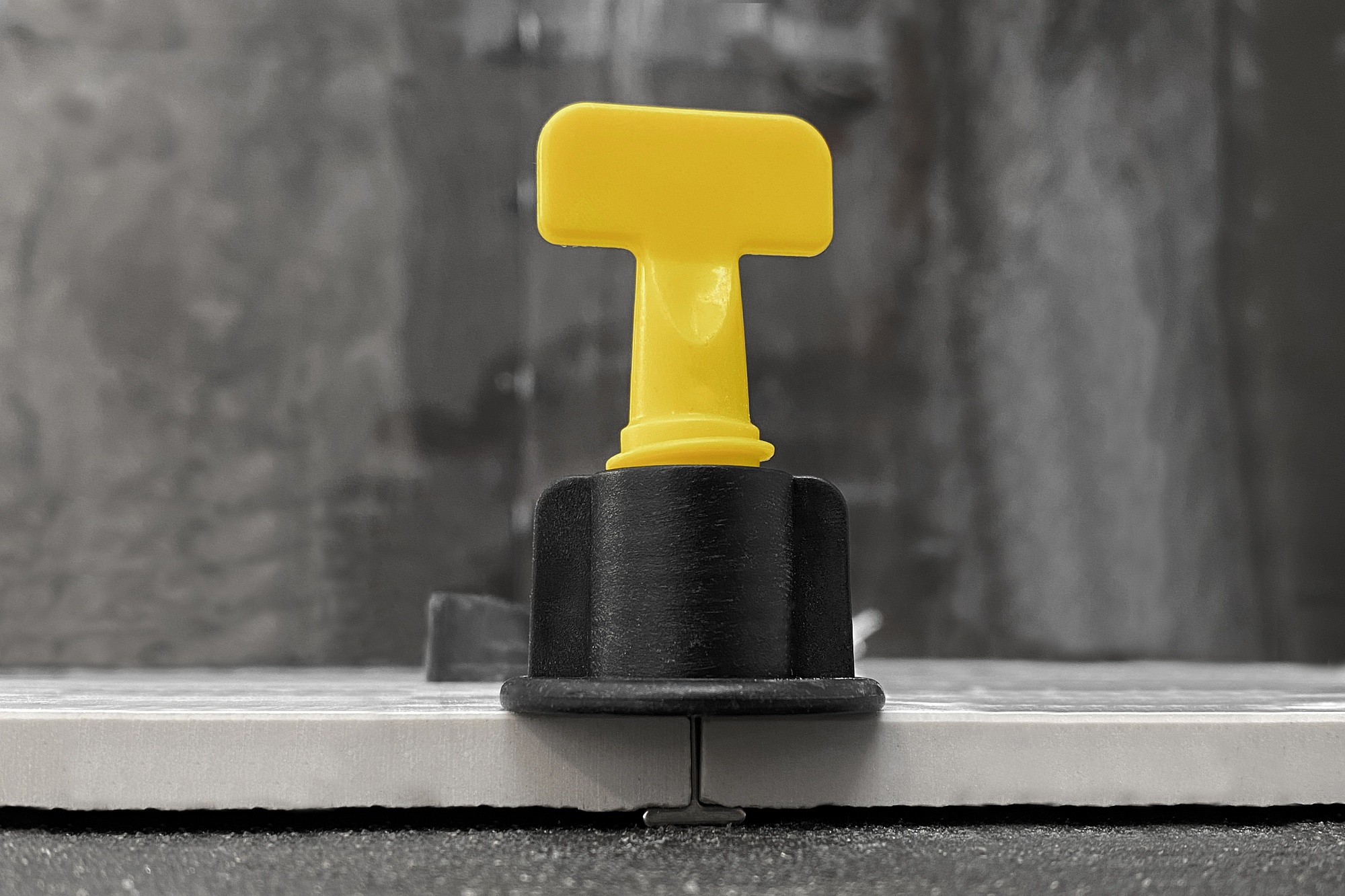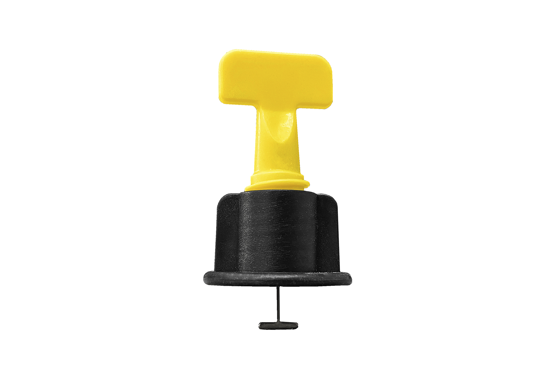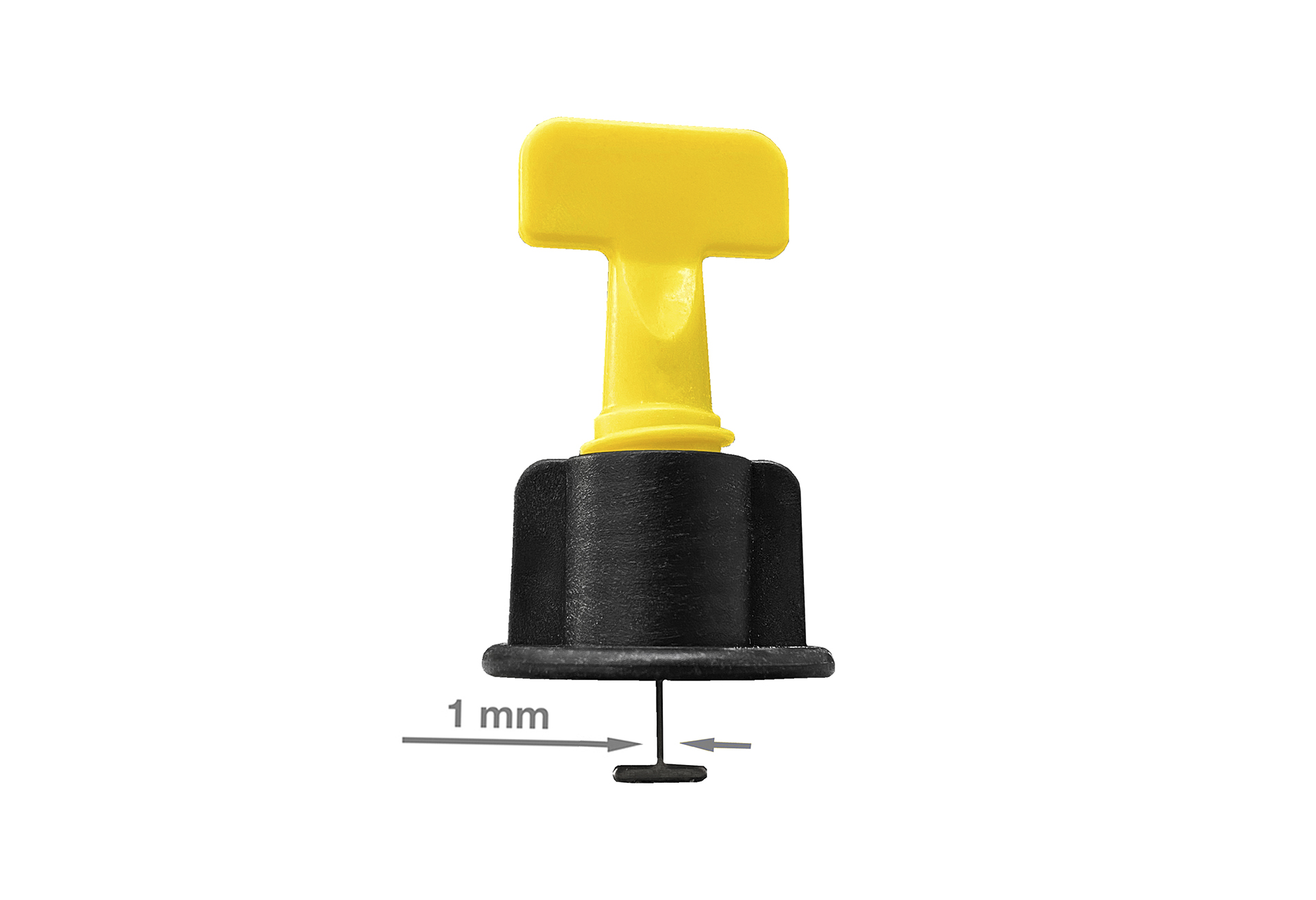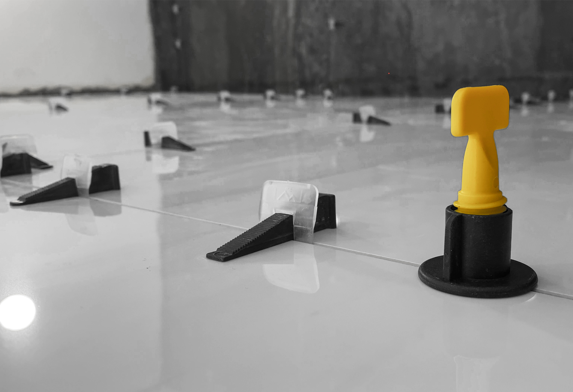 1. Вставьте фиксатор между двумя плитками таким образом, чтобы его ножка была параллельна