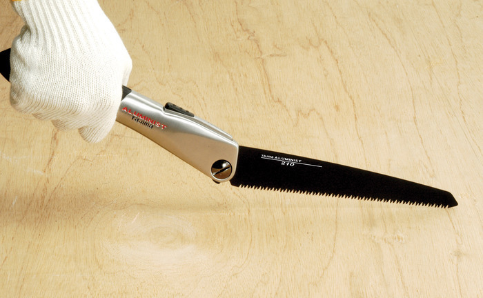 Складная ножовка с литой алюминиевой рукояткой, покрытой прочным эластомерным противоскользящим покрытием и полотном со фторовым покрытием для уменьшения внутреннего сопротивления