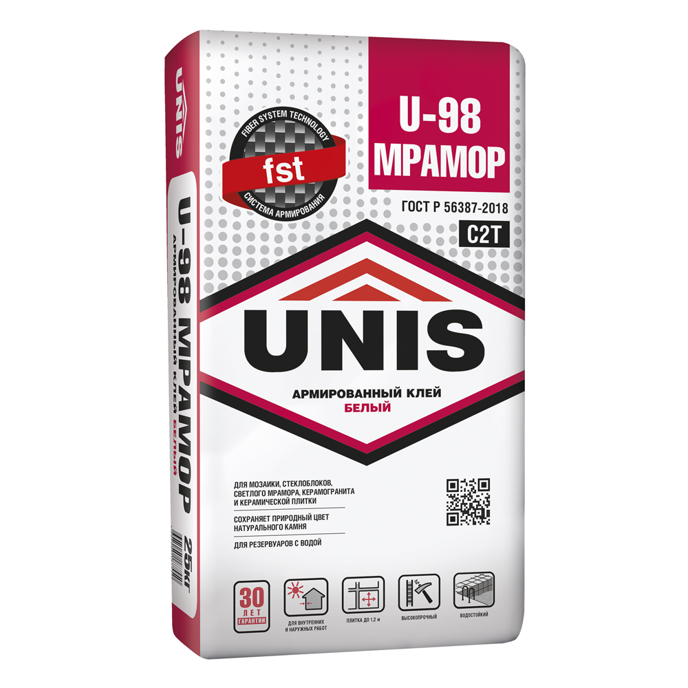 Клей U-98 МРАМОР рекомендуется для сложных задач: укладки поверх старой плитки, применения в системе «Тёплый пол», облицовки резервуаров для воды (бассейны). Может применяться в качестве затирки для широких плиточных швов и для создания художественно-декоративных эффектов (панно, рельефы и т.п.). Приклеивание керамогранита и камня с размером грани более 60 см выполнять только на жесткие недеформирующиеся основания, при креплении на цоколь и фасад использовать вспомогательное механическое крепление.