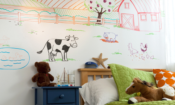 Многие родители сталкиваются с тем, что дети используют стены как полотно для своих художественных творений. В результате, перед ними встает вопрос, какую выбрать отделку. Иногда и взрослые нуждаются в большой рабочей зоне, например, в офисе для проведения совещаний. Можно повесить доску, но ее размеры могут оказаться недостаточными, и будет ли это эстетично? Лучший способ решить эту проблему с помощью маркерной краски. Поверхность может быть и магнитной, если сначала нанести на нее магнитную краску Le Vanille