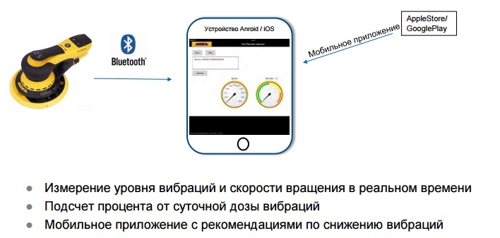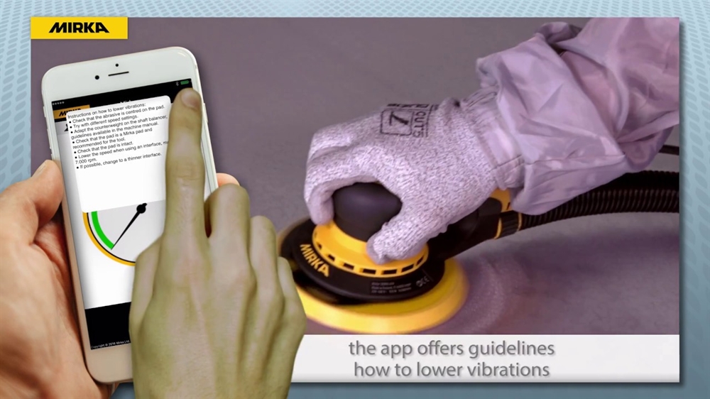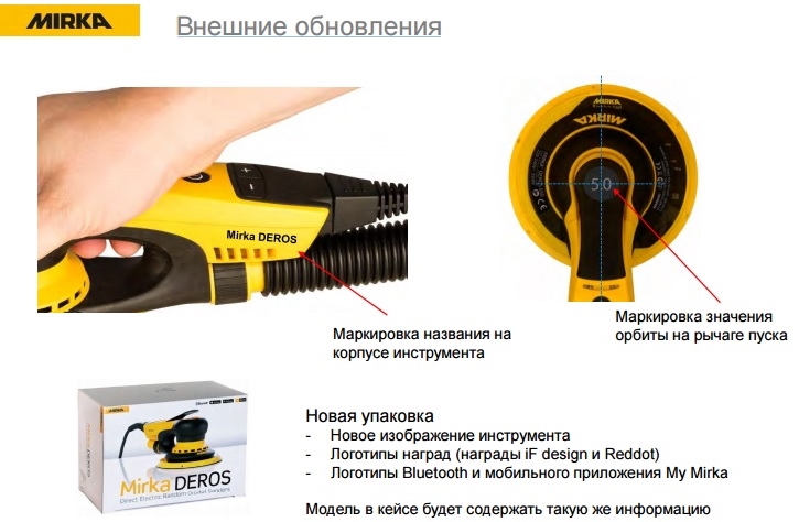 - Усовершенствованная модель Mirka DEROS со встроенным датчиком измерения вибраций и Bluetooth.