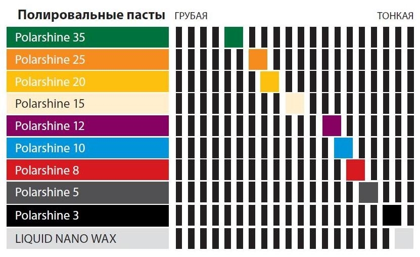 Polarshine® 5 - уникальная полировальная паста на водной основе, удаляющая голограммы и обеспечивающая превосходный блеск финишной поверхности на различных видах ЛКП. Также подходит для создания плавного перехода с зоны старого на свежее ЛКП. Для достижения высокого блеска используется в качестве завершающего шага после полировки пастами Polarshine® 15, 12 и 10.