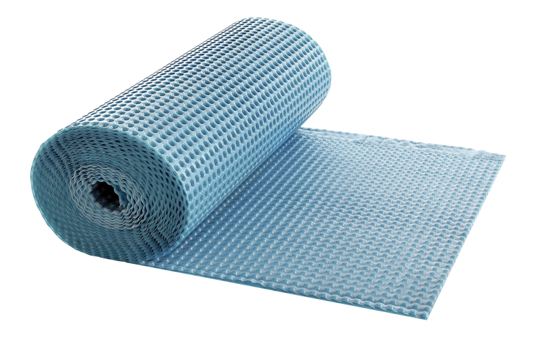 Мембрана представляет собой негибкое и очень прочное двухслойное фактурное полотно из полиэтилена. Нижняя сторона имеет конусообразные выступы, расположенные очень близко друг у другу, верхняя – полипропиленовая сетка с ячейками 2 х 2 мм.