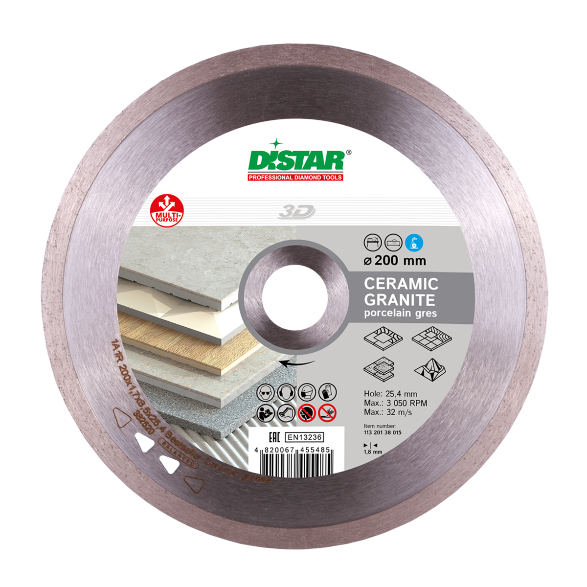 Алмазный круг DISTAR 1A1R BESTSELLER CERAMIC GRANITE является представителем класса 3D, среди сегмента недорогих инструментов для обработки плитки и керамогранита под средством мокрого способа. Прекрасно проявил себя в работе с настенной плиткой, всеми видами керамики и керамогранита, мрамором.