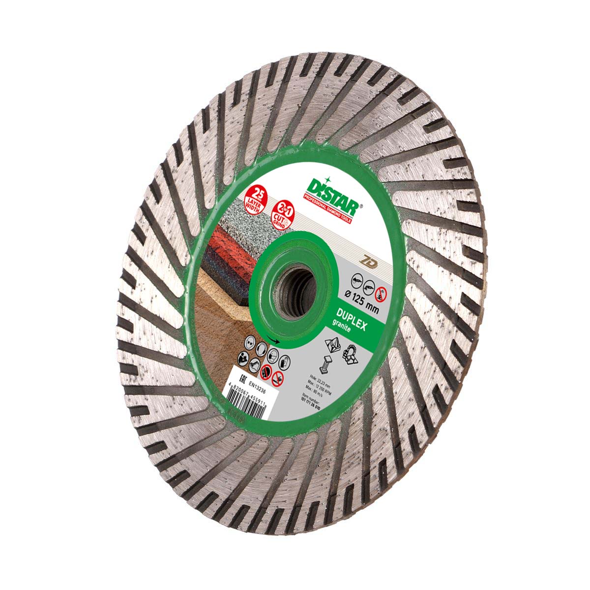Distar Duplex представлен в одном варианте, диаметром 125 миллиметров, и позволяет использовать его для любых моделей УШМ со стандартным креплением диска М14. А алмазный слой толщиной 2,8 миллиметров делает работу максимально производительной.