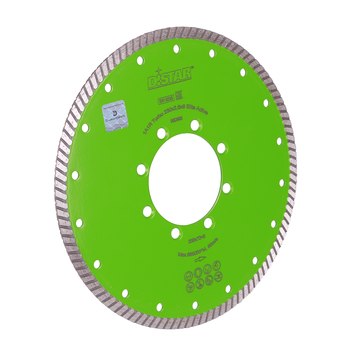 Диск алмазный Turbo Elite Active работает со скоростью реза в 1м/мин, при своем ресурсе работы в 100 погонных метров. Имеет отличную скорость резания. При этом обладает умеренным ресурсом работы, в силах справится с большинством природных материалов.