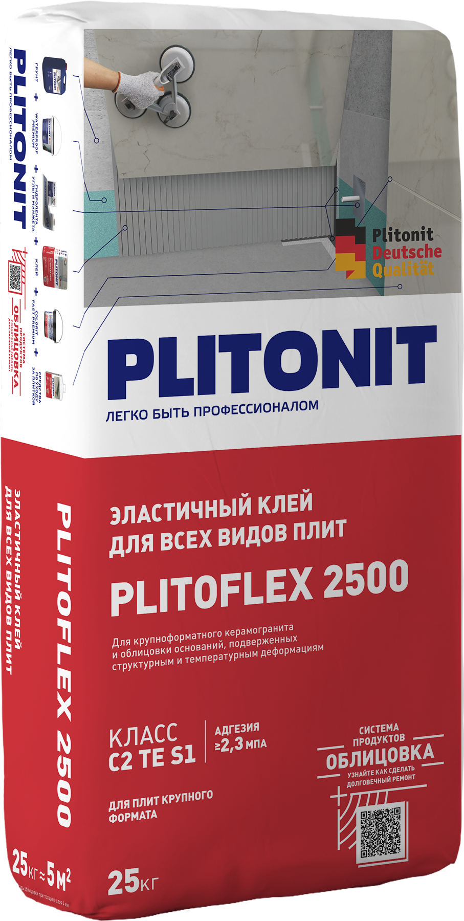 Клеевая эластичная смесь класса C2 TE S1 по ГОСТ Р 56387 предназначена для приклеивания любого типа облицовочной керамической, керамогранитной и клинкерной плитки, плитки из натурального и искусственного камня в том числе крупного формата на поверхности стен и полов из бетона, железобетона, ячеистого бетона, кирпича, гипсокартона, цементных, известково-цементных и гипсовых штукатурок, на сложных и деформирующихся основаниях и элементах конструкций, таких как ЦСП, ДСП при проведении внутренних и наружных работ. Эластичные свойства PLITOFLEX 2500 компенсируют возникающие напряжения между плитами и основаниями при их структурных и температурных деформациях, найдя свое применения в том числе на сложных (плитка на плитку, поверх эластичных полимерных гидроизоляционных материалов) и деформирующихся основаниях. Применяется при строительстве и ремонте жилых и общественных зданий и сооружений, в том числе учебно-воспитательных заведениях, детских, дошкольных, школьных и медицинских учреждениях (в т.ч. лечебно-профилактических и санаторно-курортных).