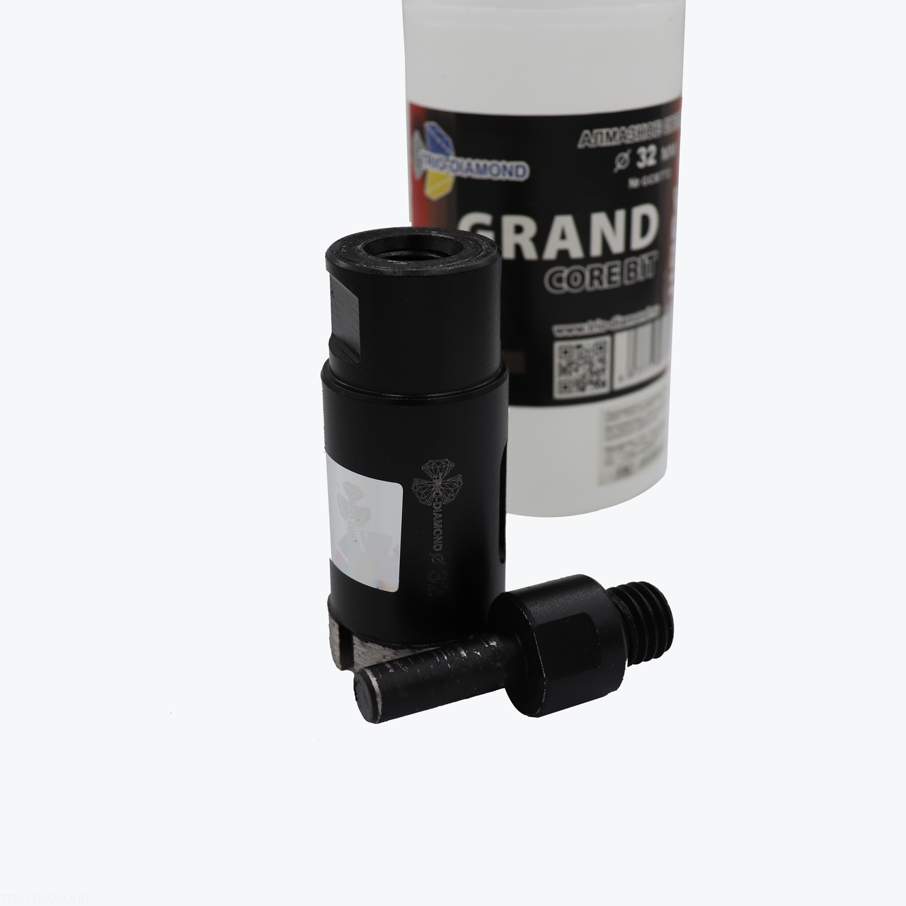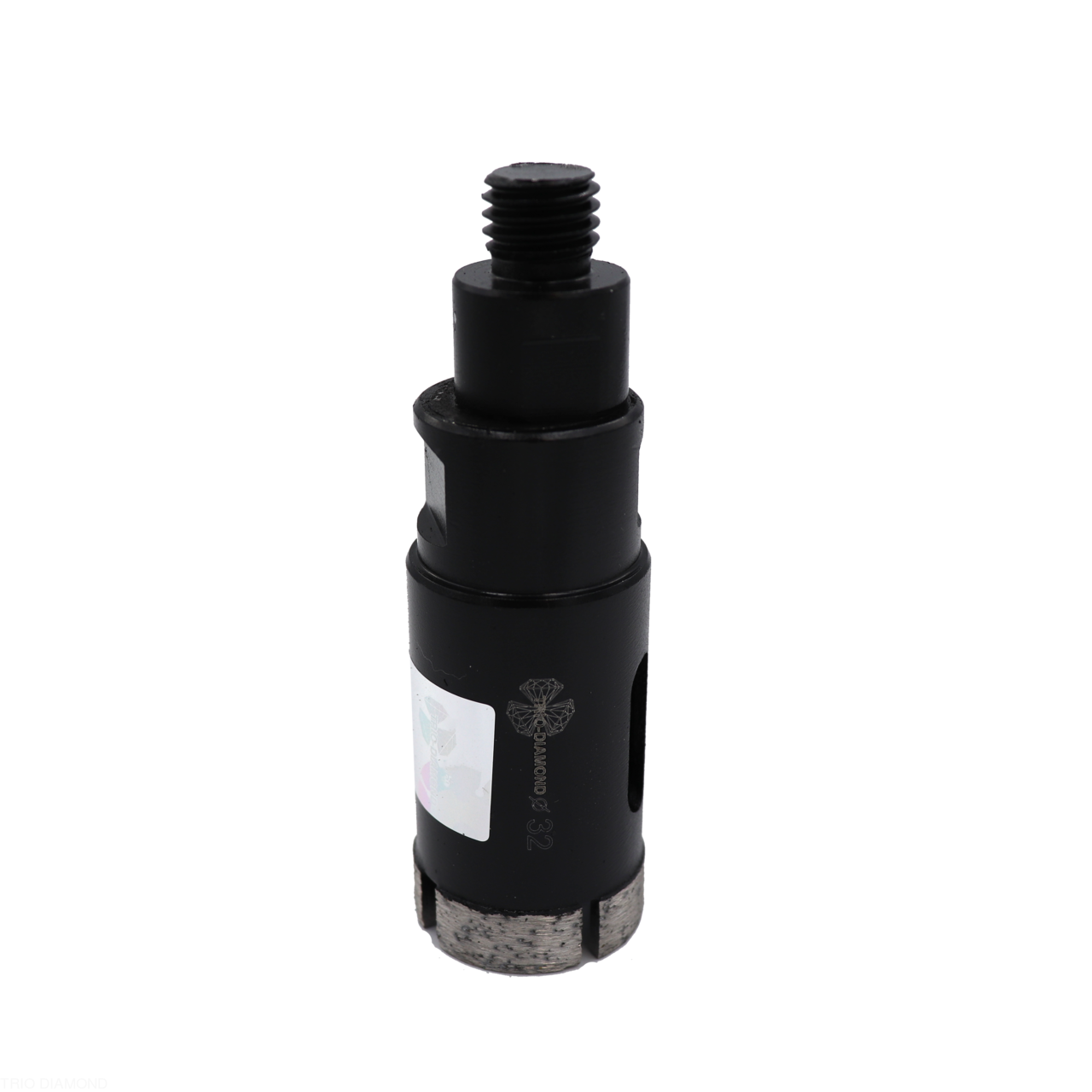 Особенности: коронка оснащена съемным цилиндрическим хвостовиком с резьбовым соединением М14, что позволяет высверливать отвертия с помощию дрелей и УШМ. Для работ с водяным охлаждением в безударном режиме.
