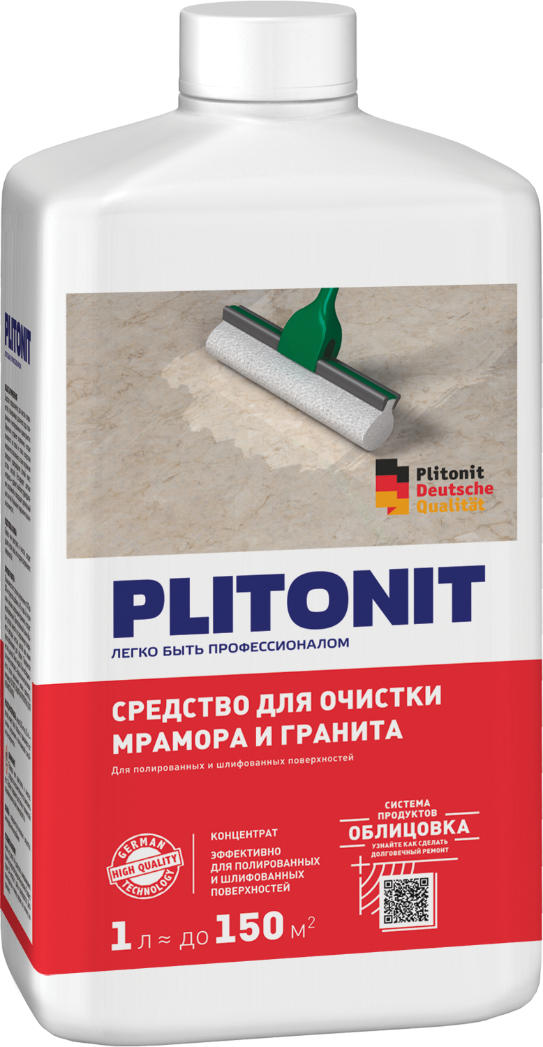 Является идеальным средством для очистки натурального камня, такого как: мрамор и гранит (пиленый, полированный и шлифованный). Продукт удаляет загрязнения природного происхождения (птичий помет, остатки листьев, налеты), а также загрязнения, появляющиеся в следствие ежедневного использования поверхностей.