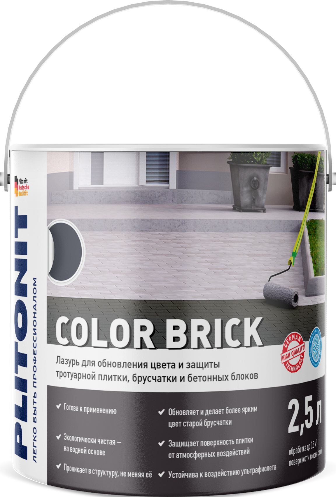 Перелейте лазурь Plitonit Color Brick в удобную малярную ёмкость. В первую очередь нанесите материал на труднодоступные элементы (в углах, вдоль бордюров и т.д.) с помощью кисти. Далее широкой кистью или валиком нанесите лазурь на основную поверхность, равномерно распределяя её. Не допускайте образования луж. Старайтесь единовременно обрабатывать большие поверхности без остановок и перерывов в работе, так как это может привести к образованию видимых границ. По возможности наносите лазурь по направлению вдоль длинных сторон брусчатки.