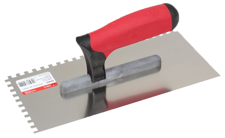 Гребёнка предназначена для равномерного нанесения клеевого раствора. Высокое содержание никеля обеспечивает эластичность и твёрдость. Гребёнка выполнена из нержавеющей стали толщиной 0,7 мм. Зеркально гладкое исполнение. Эргономичная рукоятка. Артикул:  0242C
