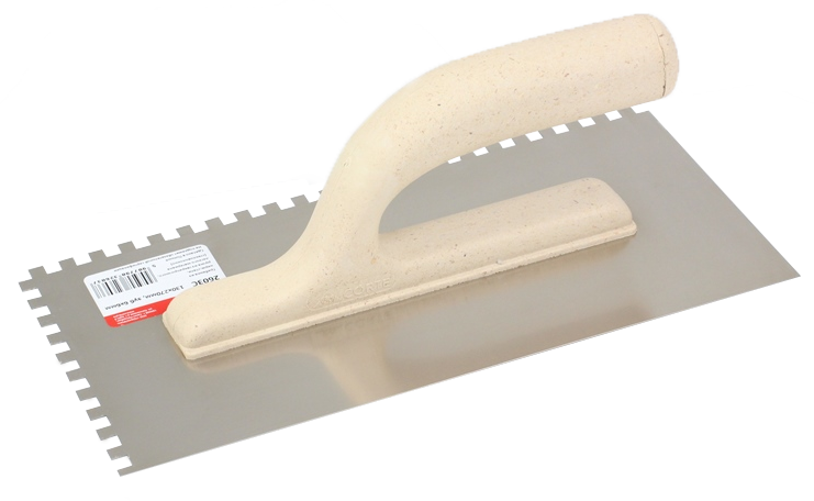 Гребёнка предназначена для нанесения и распределения клеевых растворов и создания на их поверхности гребенчатой структуры. Ручка выполнена из прочного и лёгкого материала - стекловолокна. Артикул:  2603C