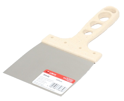 Рабочая поверхность шпателя выполнена из нержавеющей стали, а ручка из стекловолокна (сверхпрочного и лёгкого материала). Шпатель предназначен для нанесения шпаклевок и других строительных растворов на широкий шпатель, а также для заделки небольших трещин и швов.  Артикул:  2664C