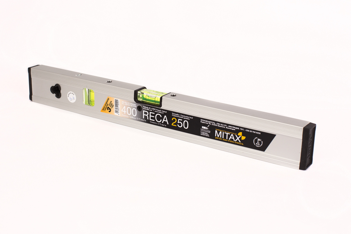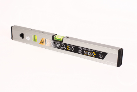 Профессиональный пузырьковый уровень MITAX RECA250 длиной 400 мм. Имеет 2 пузырька. Уровень предназначен для оценки соответствия поверхностей с горизонтальной и вертикальной плоскостью. Артикул:  400Reca250